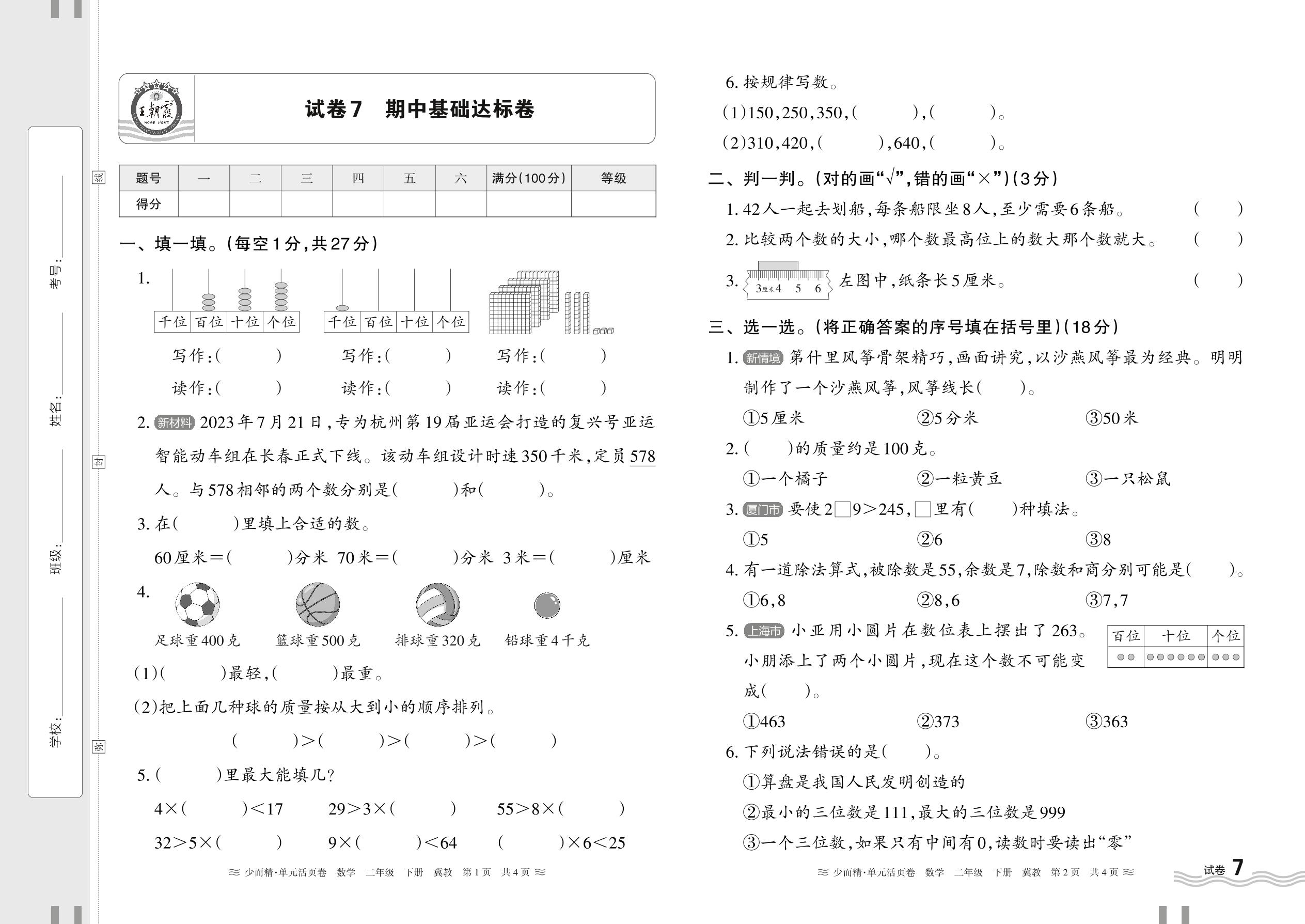 2024春下册二年级数学冀教版 期中基础达标卷【7】