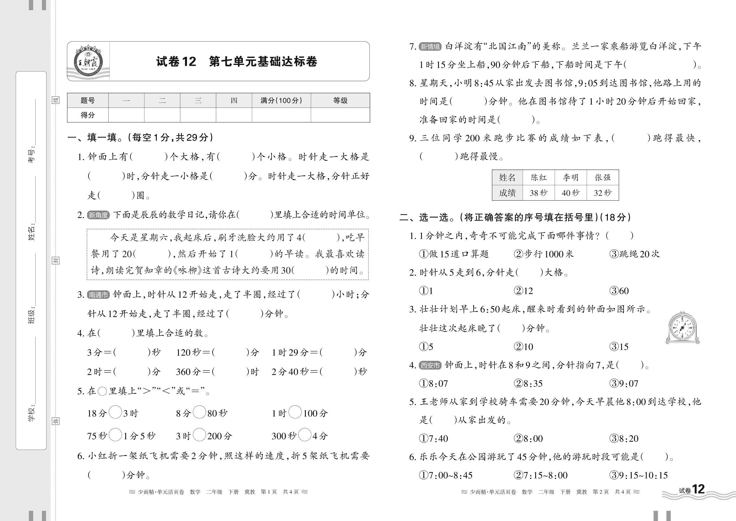 2024春下册二年级数学冀教版 第七单元基础达标卷【12】