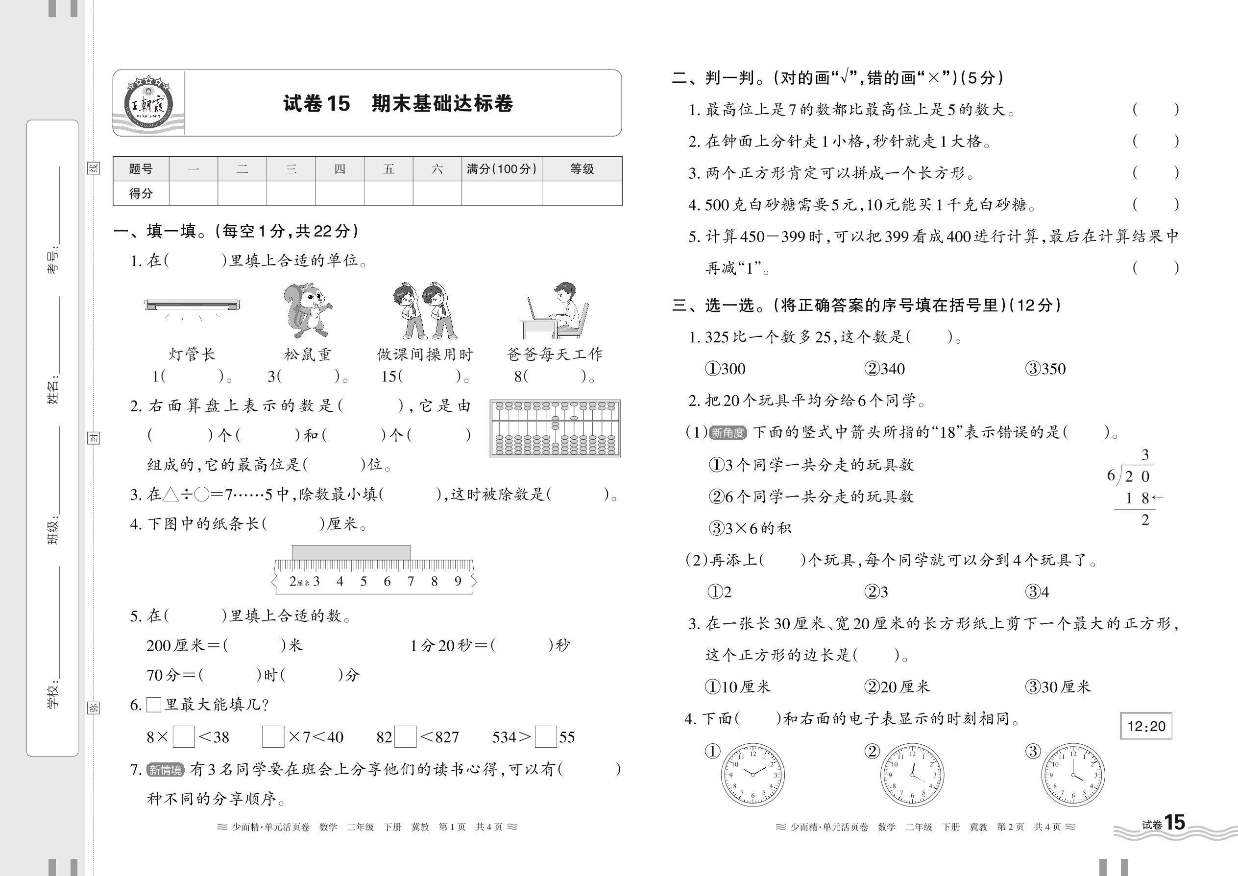 2024春下册二年级数学冀教版 期末基础达标卷【15】