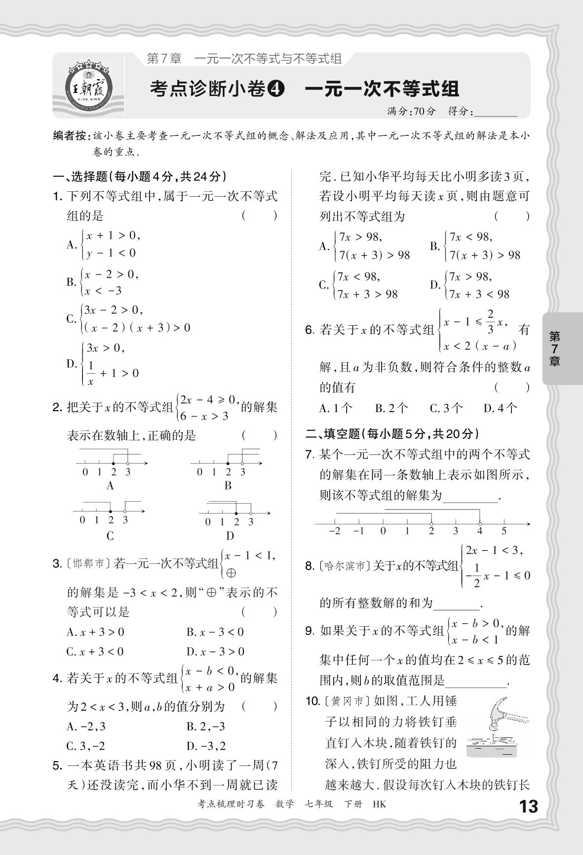 2024春下册七年级数学沪科版 第7章 考点诊断小卷 一元一次不等式组【4】