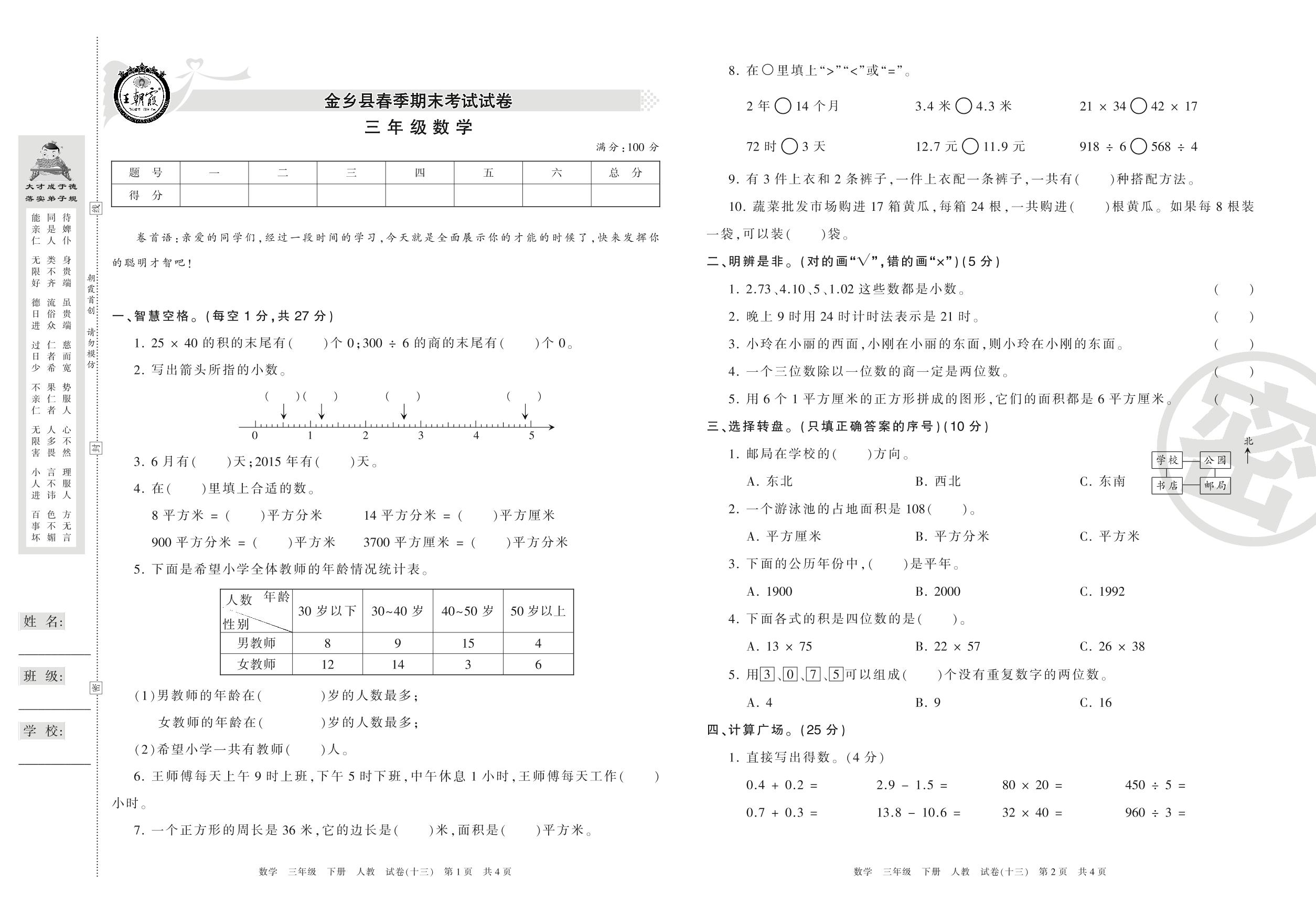 2015-2016学年第二学期济宁市金乡县三年级数学试卷(人教版)【13】
