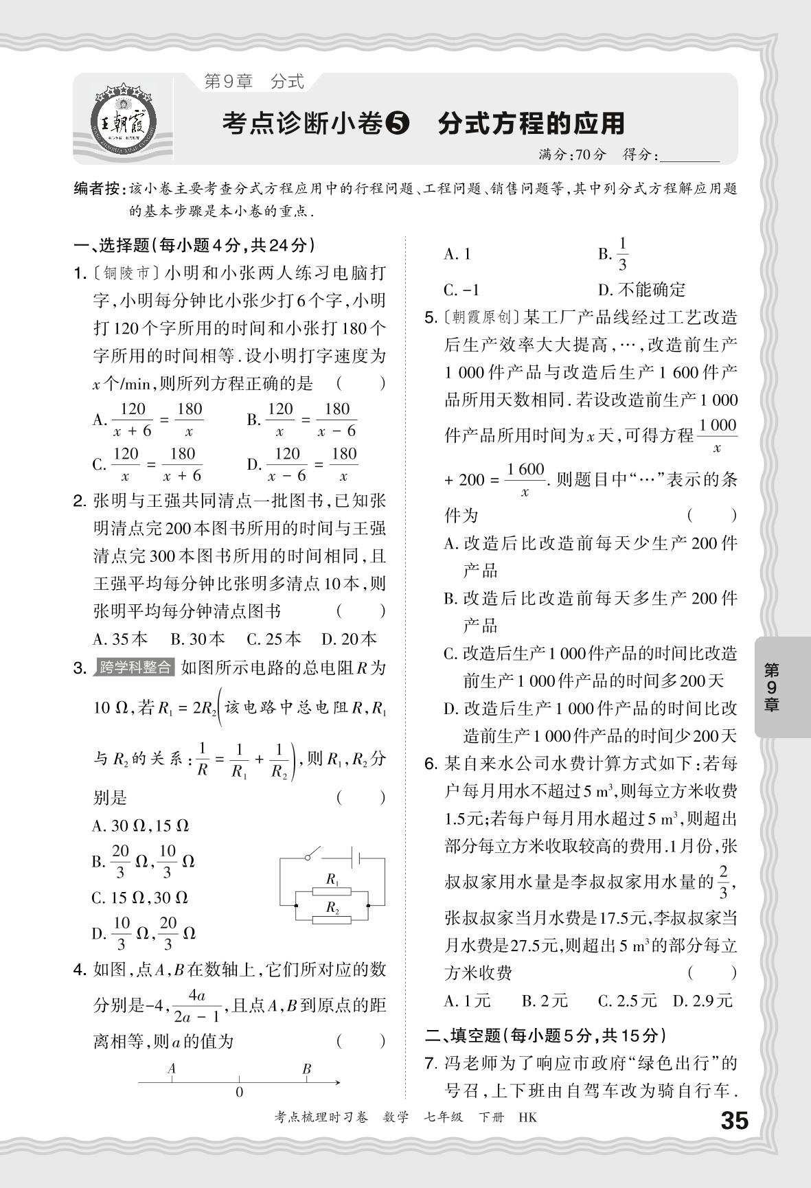 2024春下册七年级数学沪科版 第9章 考点诊断小卷 分式方程的应用【5】