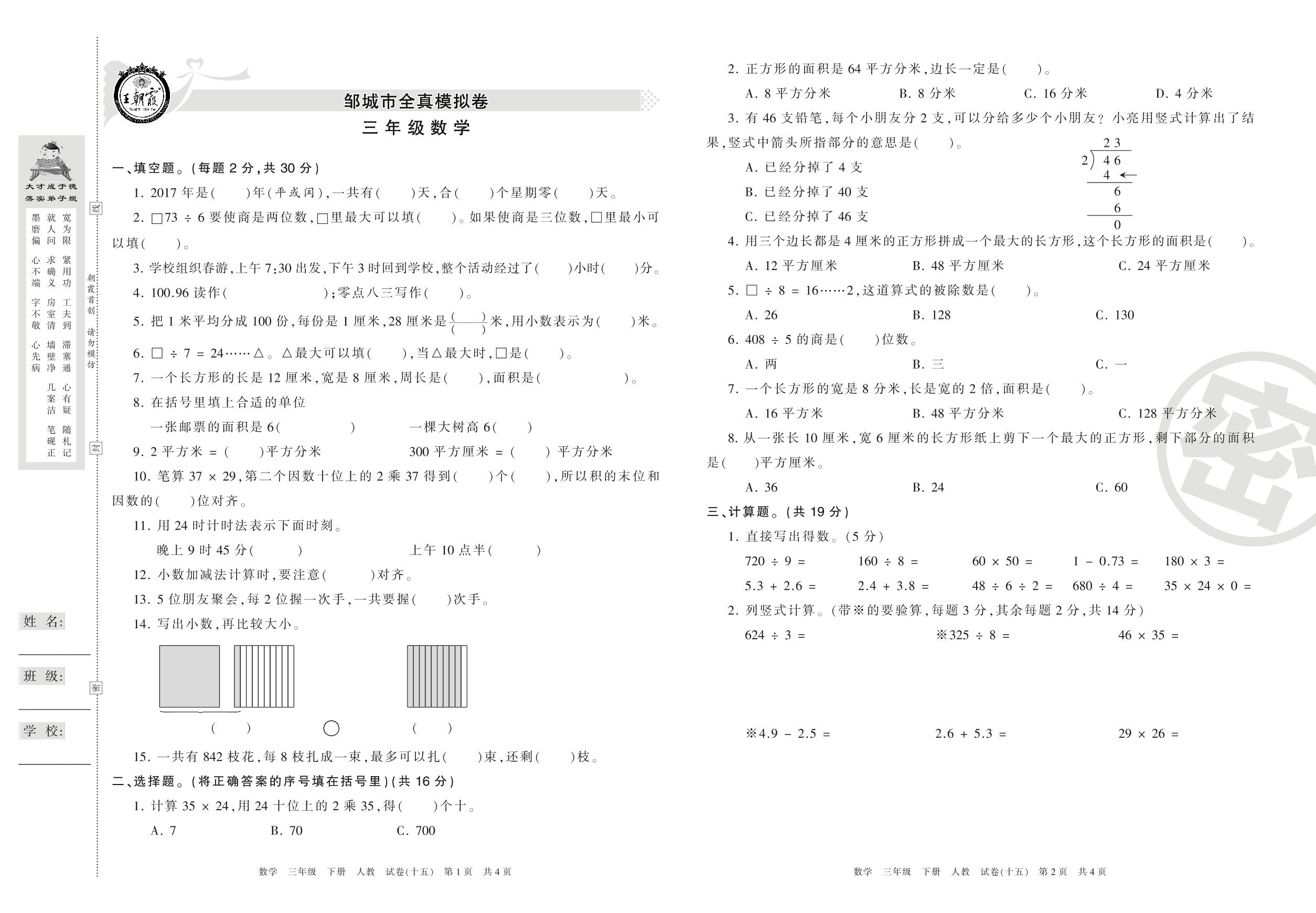 邹城市全真模拟卷三年级下册数学(人教版)【15】