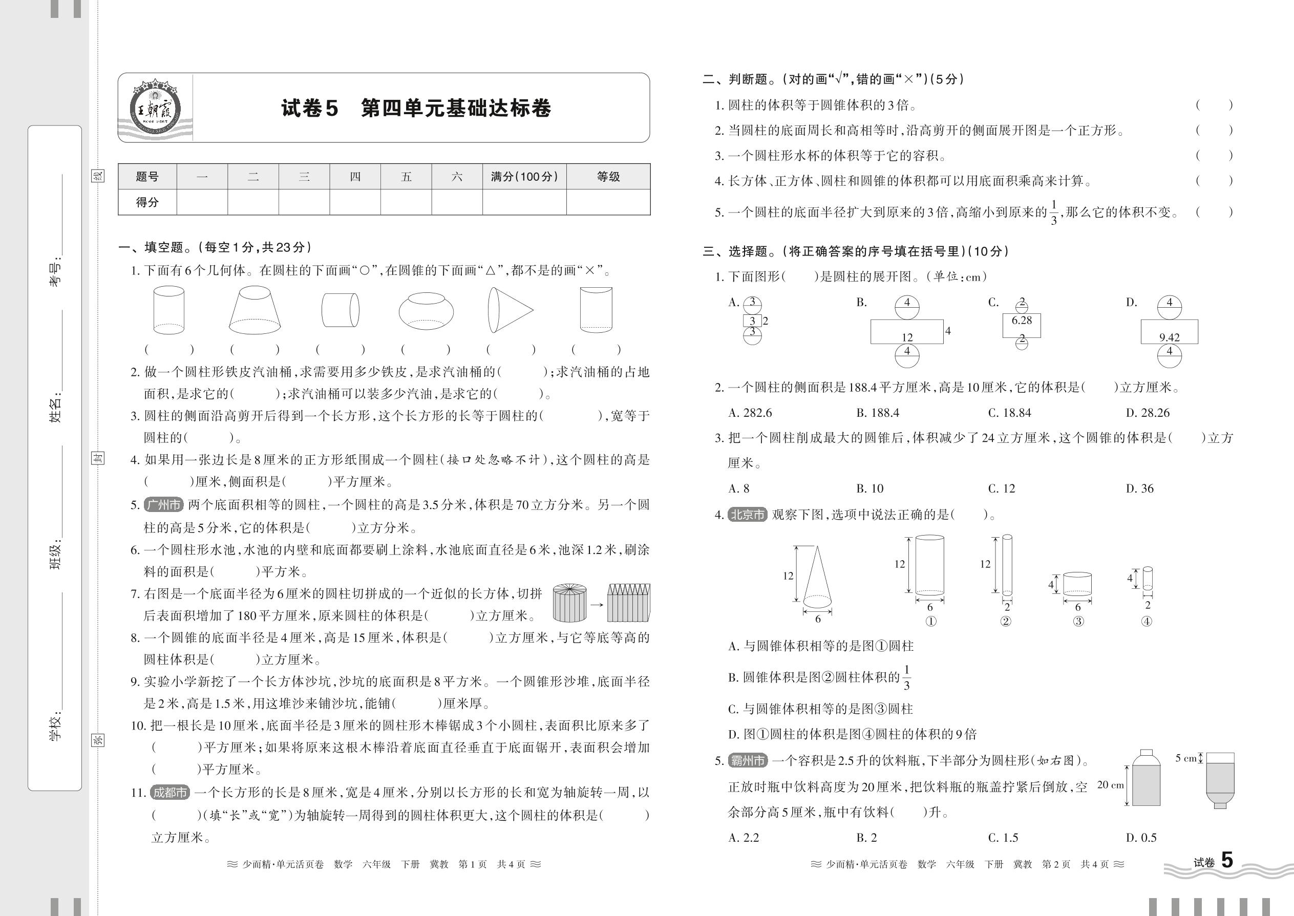 2024春下册六年级数学冀教版 第四单元基础达标卷【5】