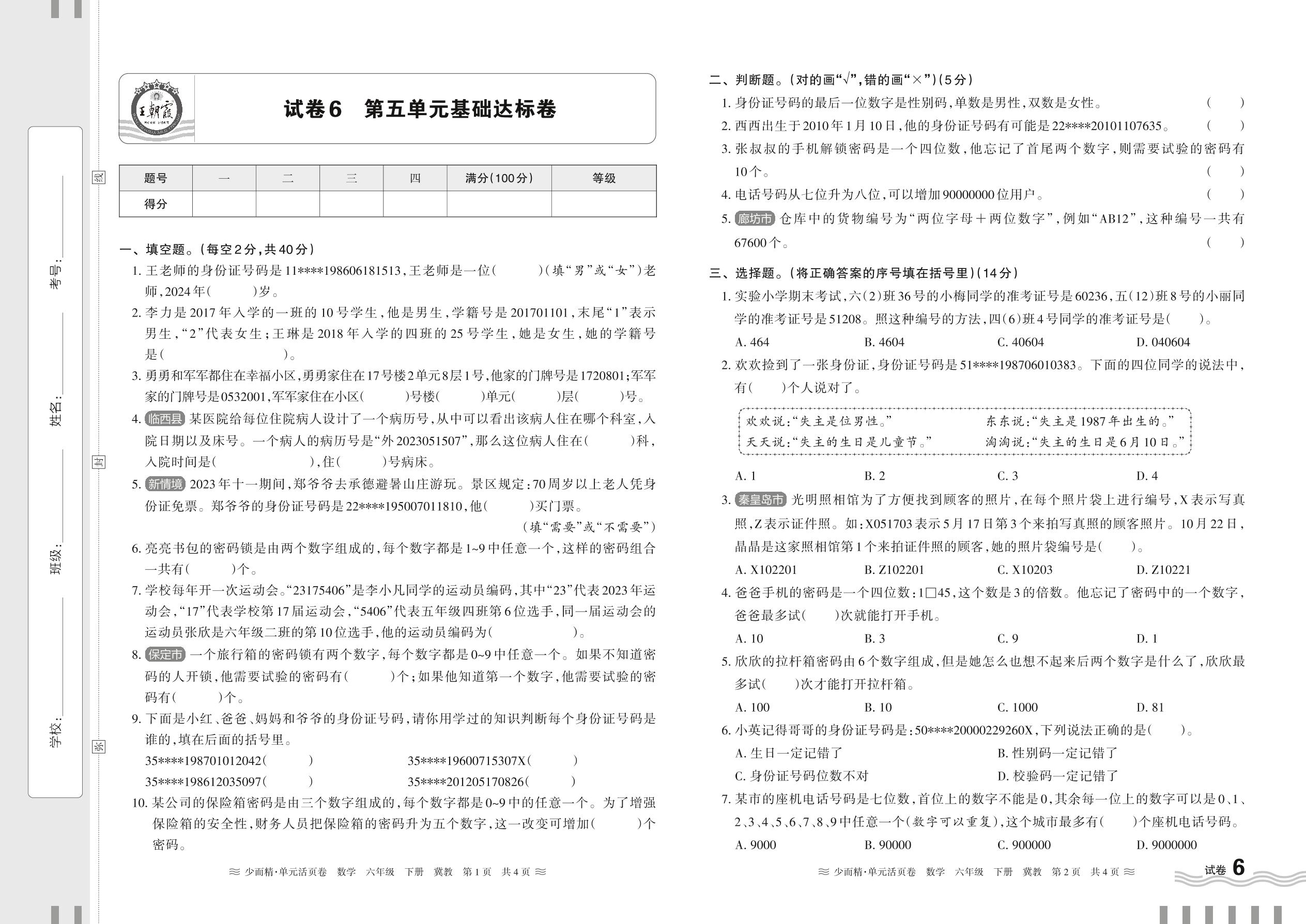 六年级数学冀教版下册单元卷