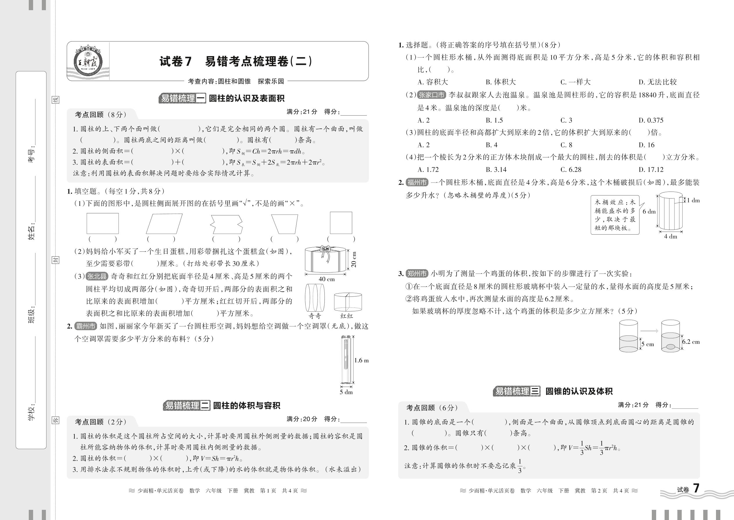 2024春下册六年级数学冀教版 易错考点梳理卷——圆柱和圆锥 探索乐园【7】