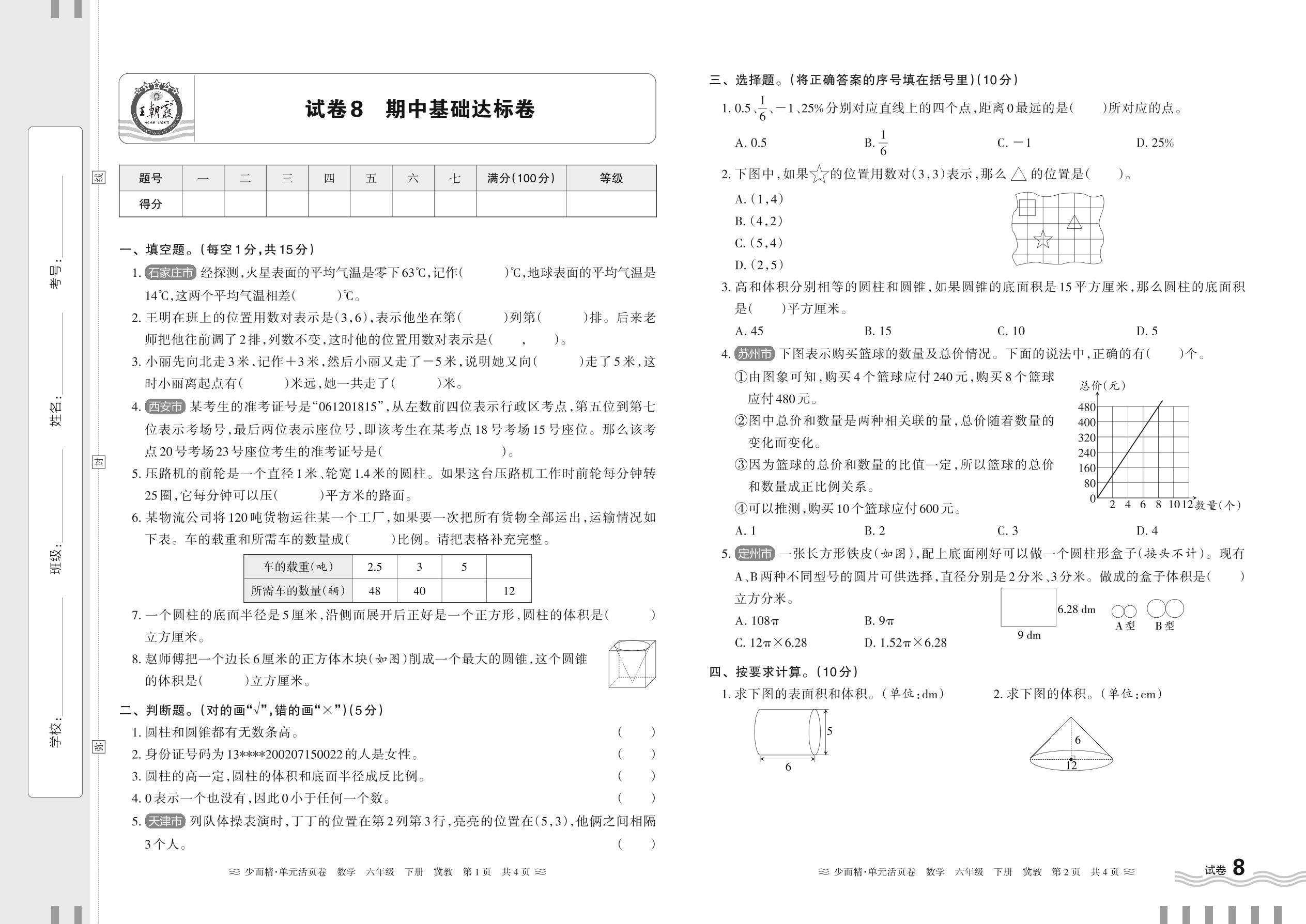 2024春下册六年级数学冀教版 期中基础达标卷【8】