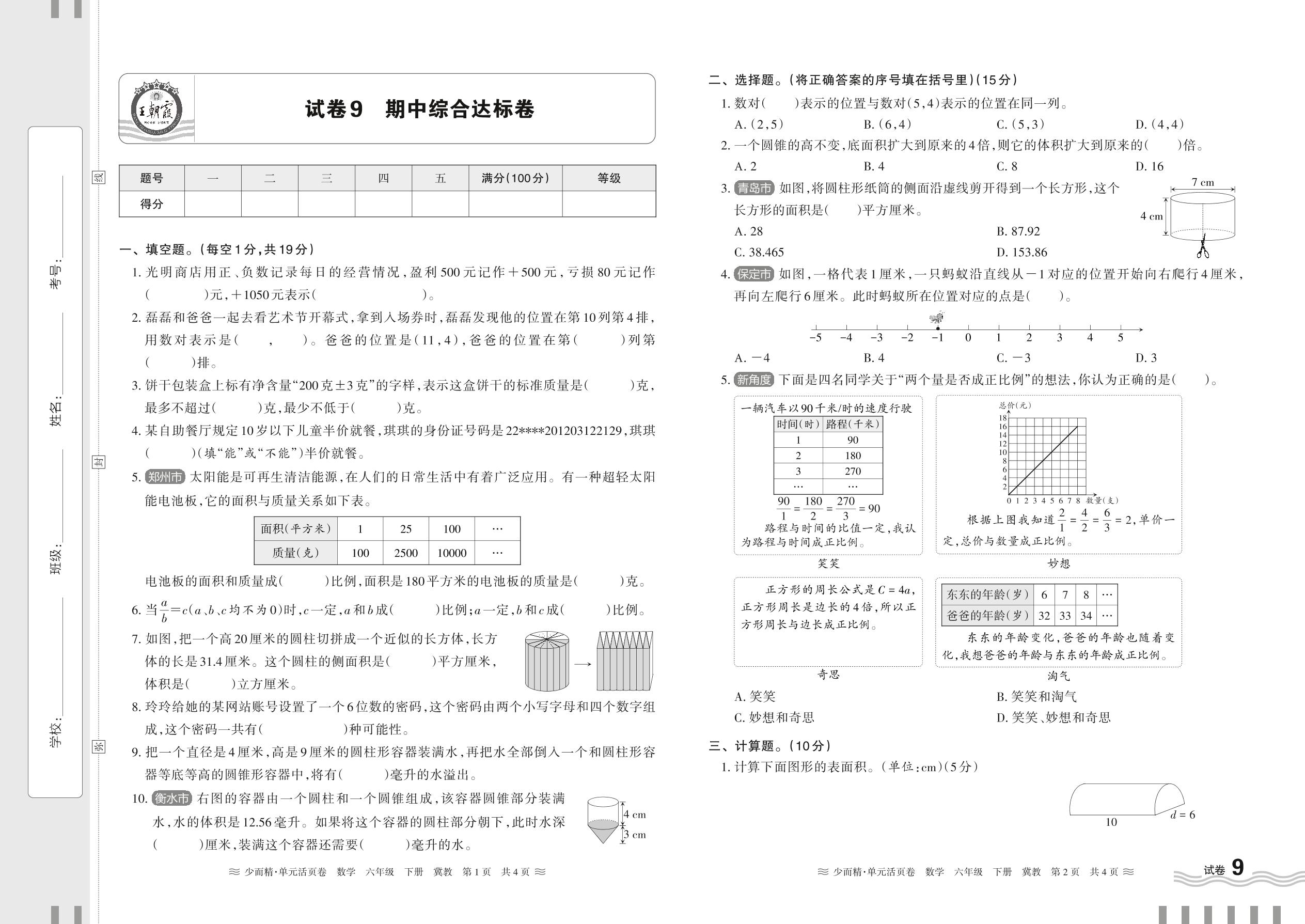 2024春下册六年级数学冀教版 期中综合达标卷【9】