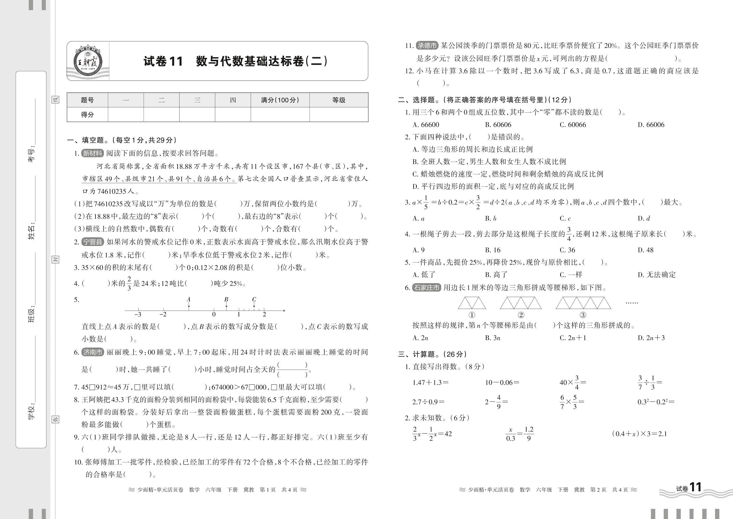 2024春下册六年级数学冀教版 数与代数基础达标卷(二)【11】