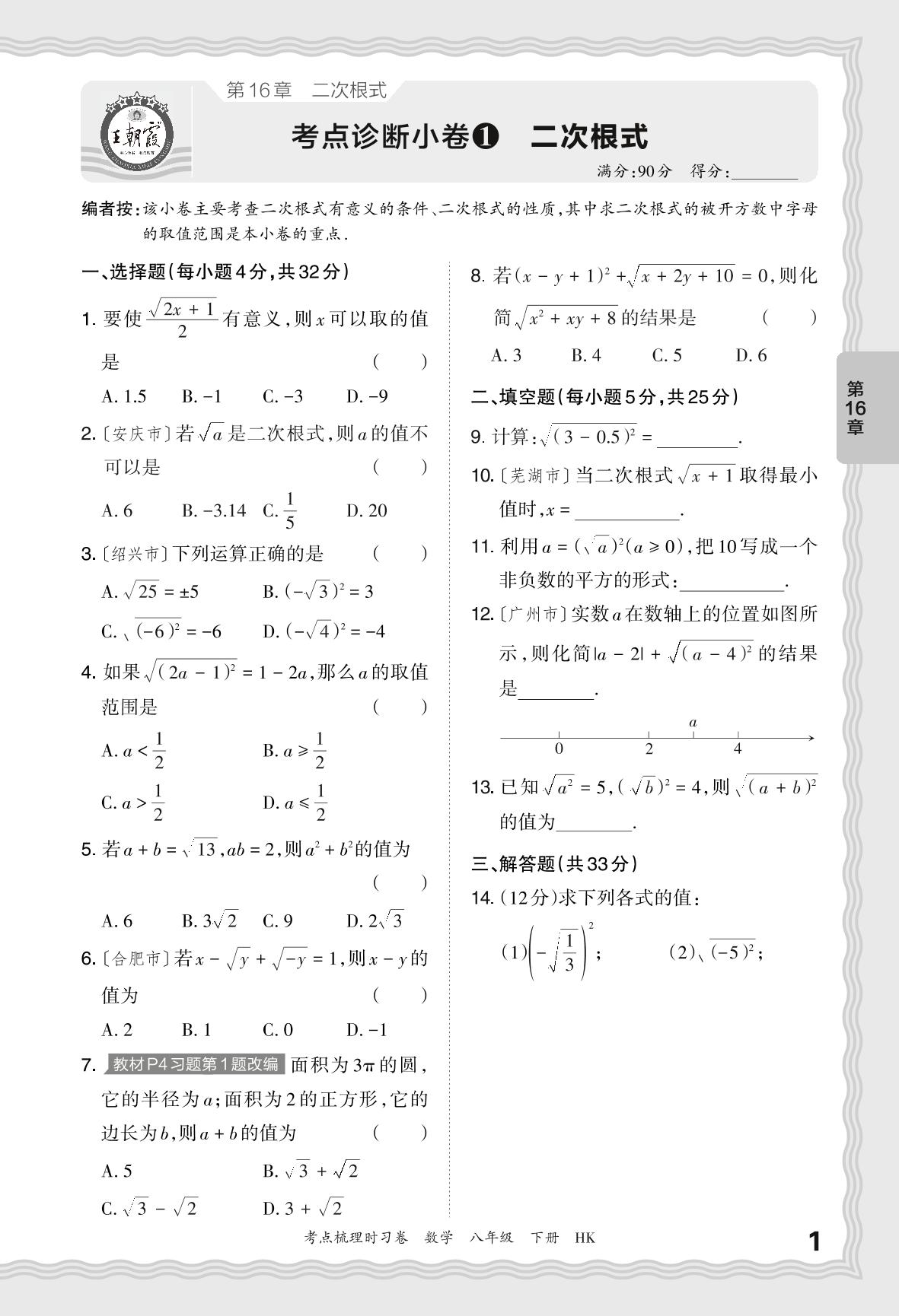 2024春下册八年级数学沪科版 第16章 考点诊断小卷 二次根式【1】