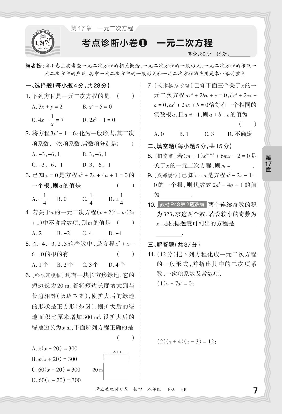 2024春下册八年级数学沪科版 第17章 考点诊断小卷 一元二次方程【1】