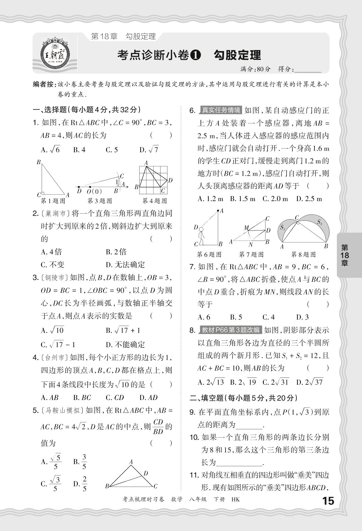 2024春下册八年级数学沪科版 第18章 考点诊断小卷 勾股定理【1】