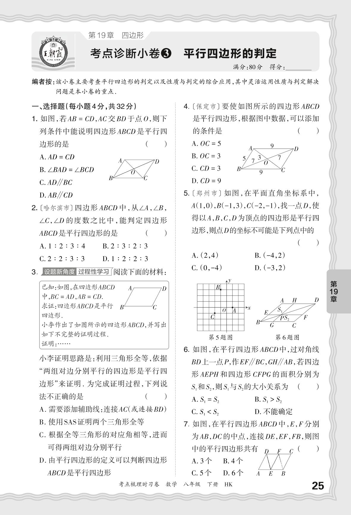 2024春下册八年级数学沪科版 第19章 考点诊断小卷 平行四边形的判定【3】
