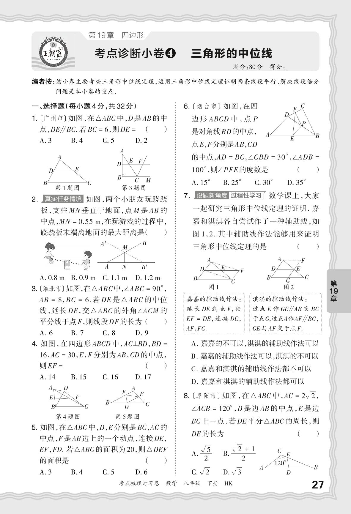 2024春下册八年级数学沪科版 第19章 考点诊断小卷 三角形的中位线【4】