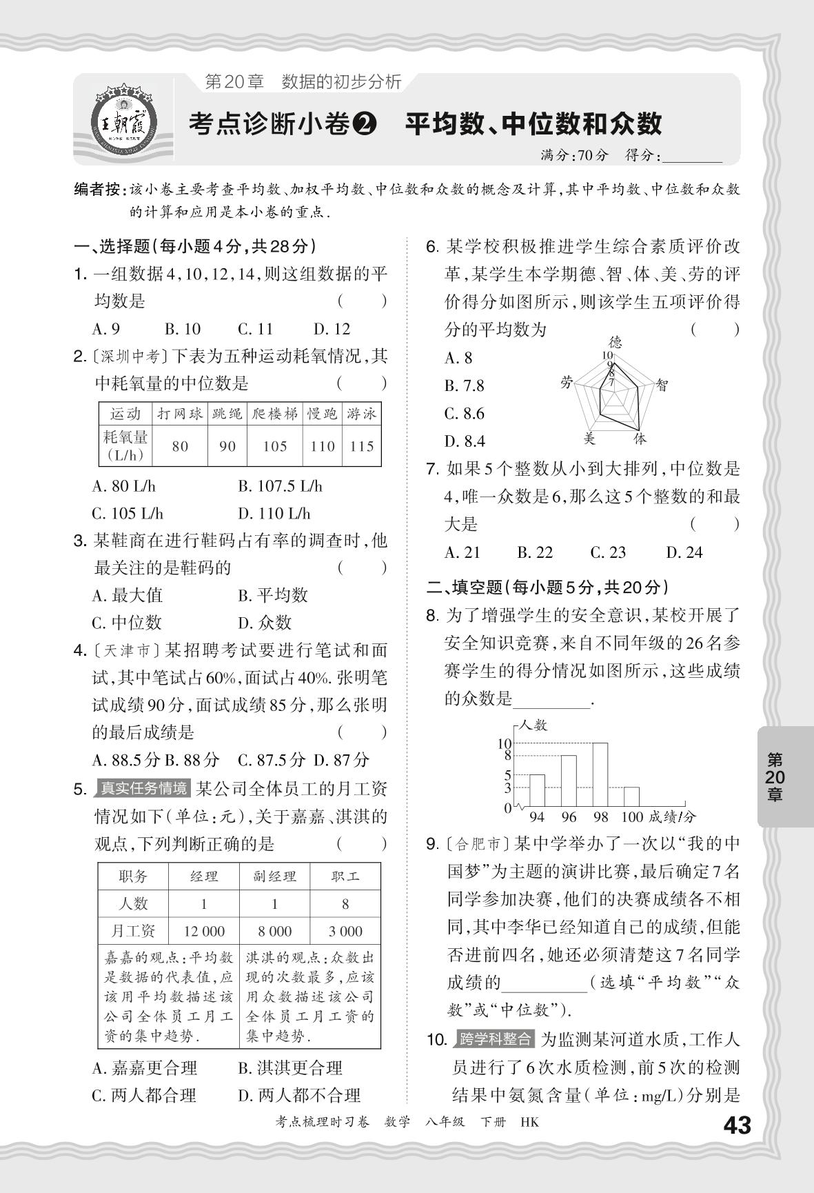 2024春下册八年级数学沪科版 第20章 考点诊断小巷 平均数、中位数和众数【2】