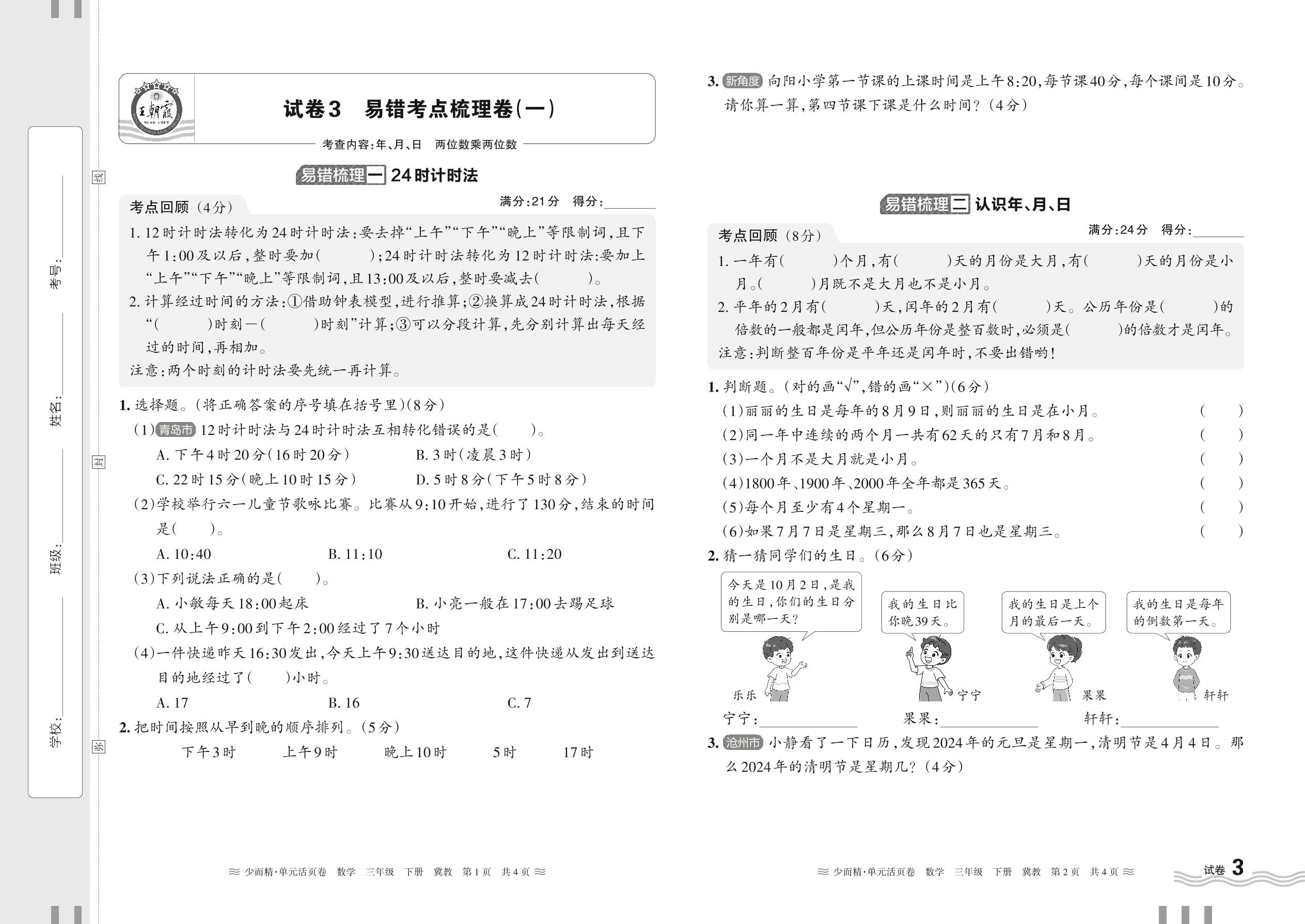 2024春下册三年级数学冀教版 易错考点梳理卷——年、月、日 两位数乘两位数【3】