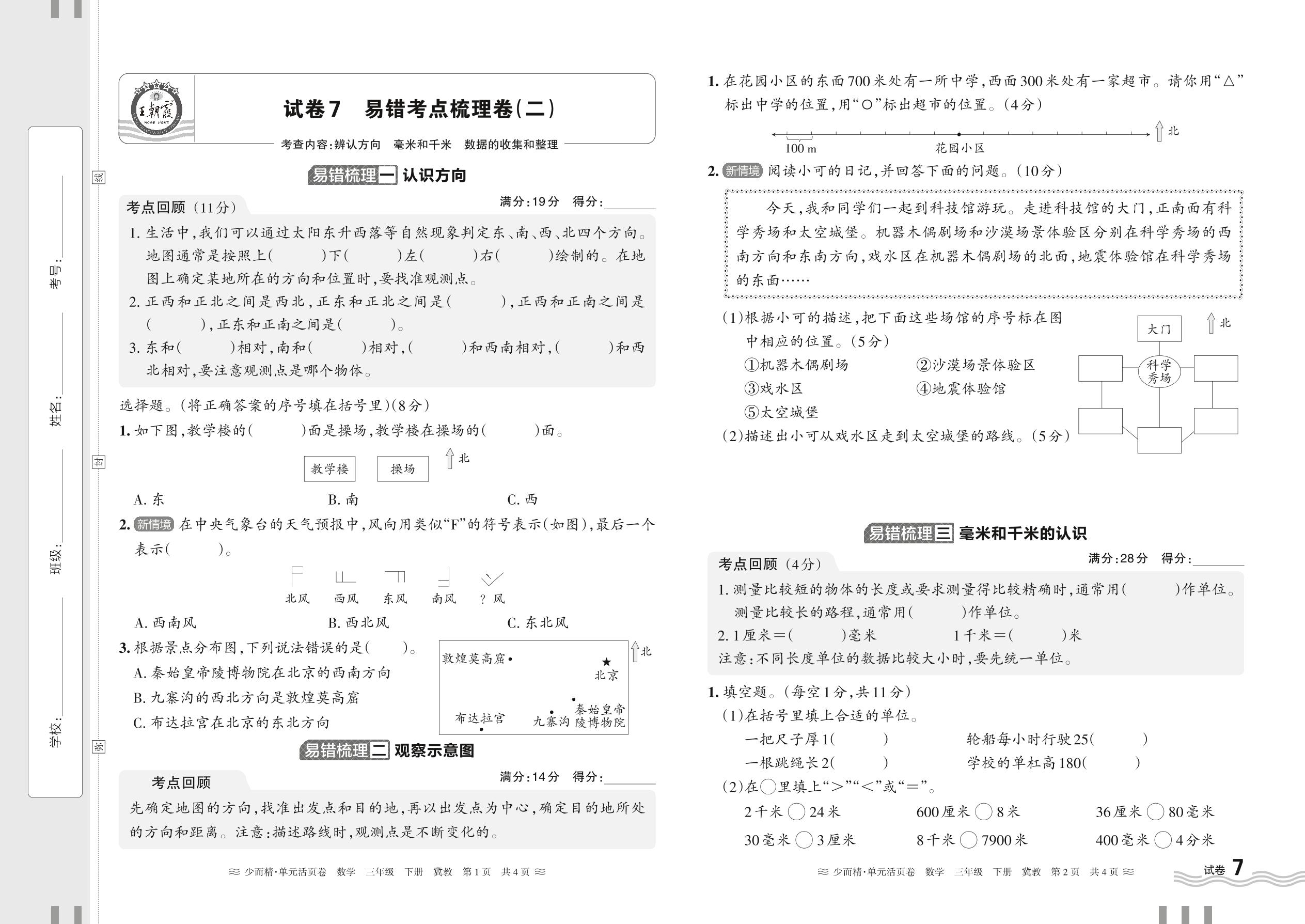 2024春下册三年级数学冀教版 易错考点梳理卷——辨认方向 毫米和千米 数据的收集和整理【7】