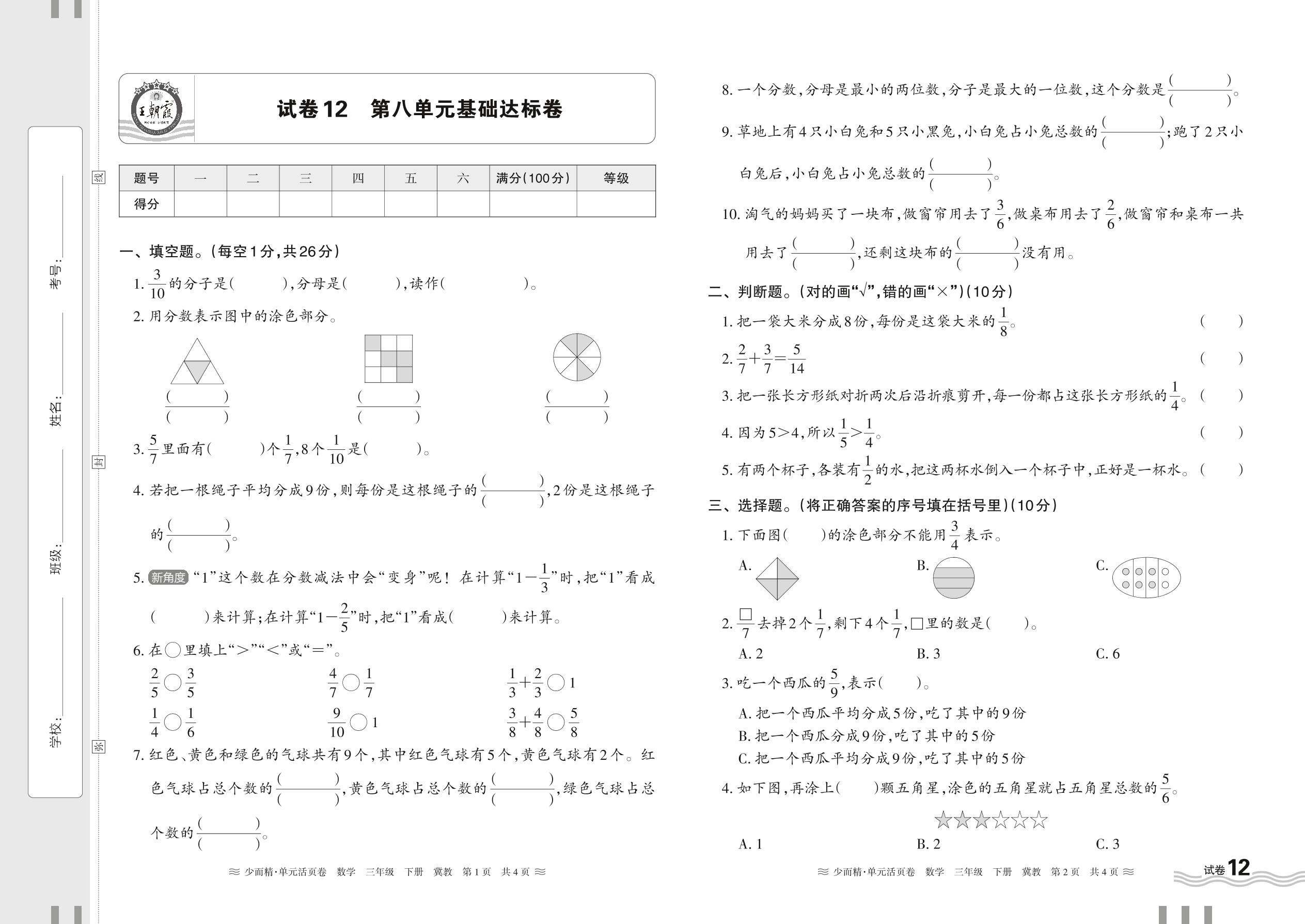 2024春下册三年级数学冀教版 第八单元基础达标卷【12】