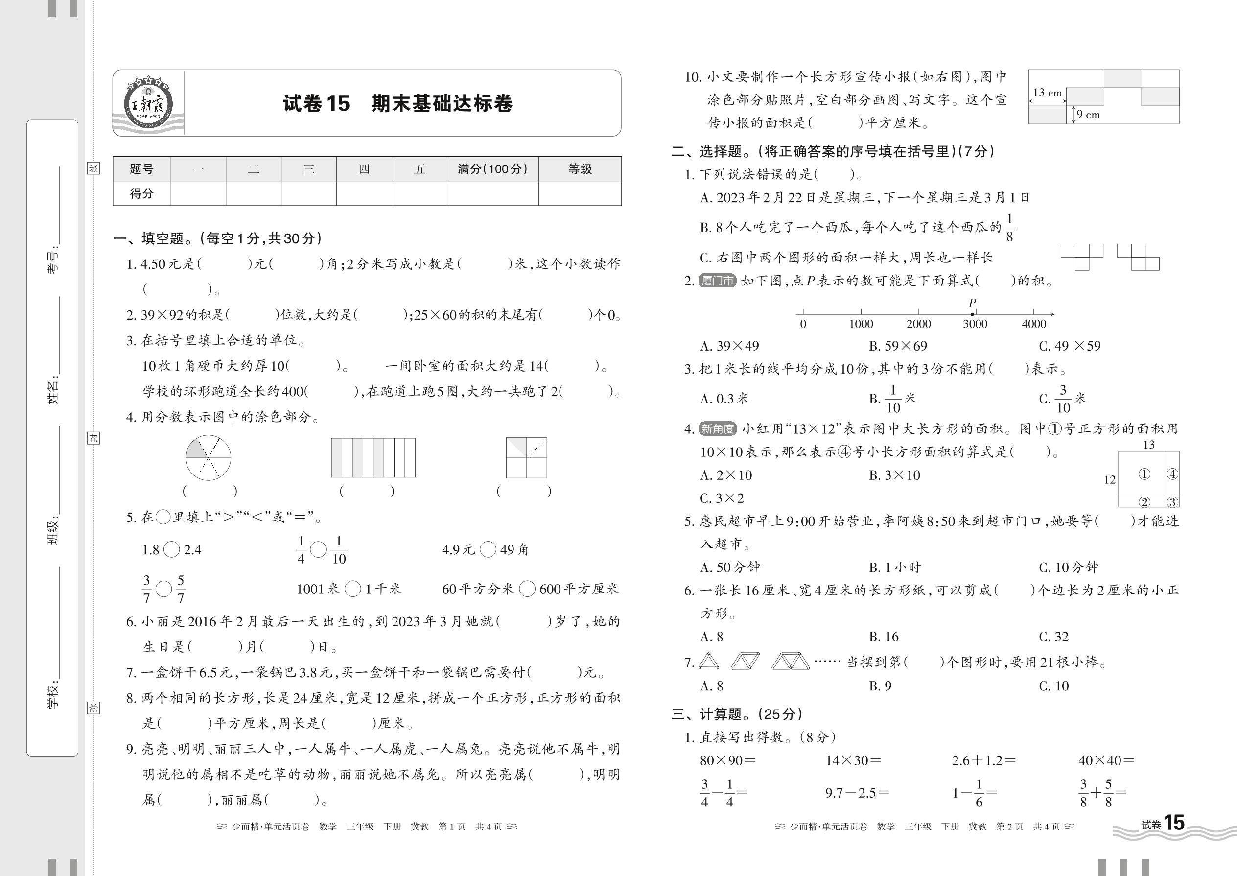 2024春下册三年级数学冀教版 期末基础达标卷【15】