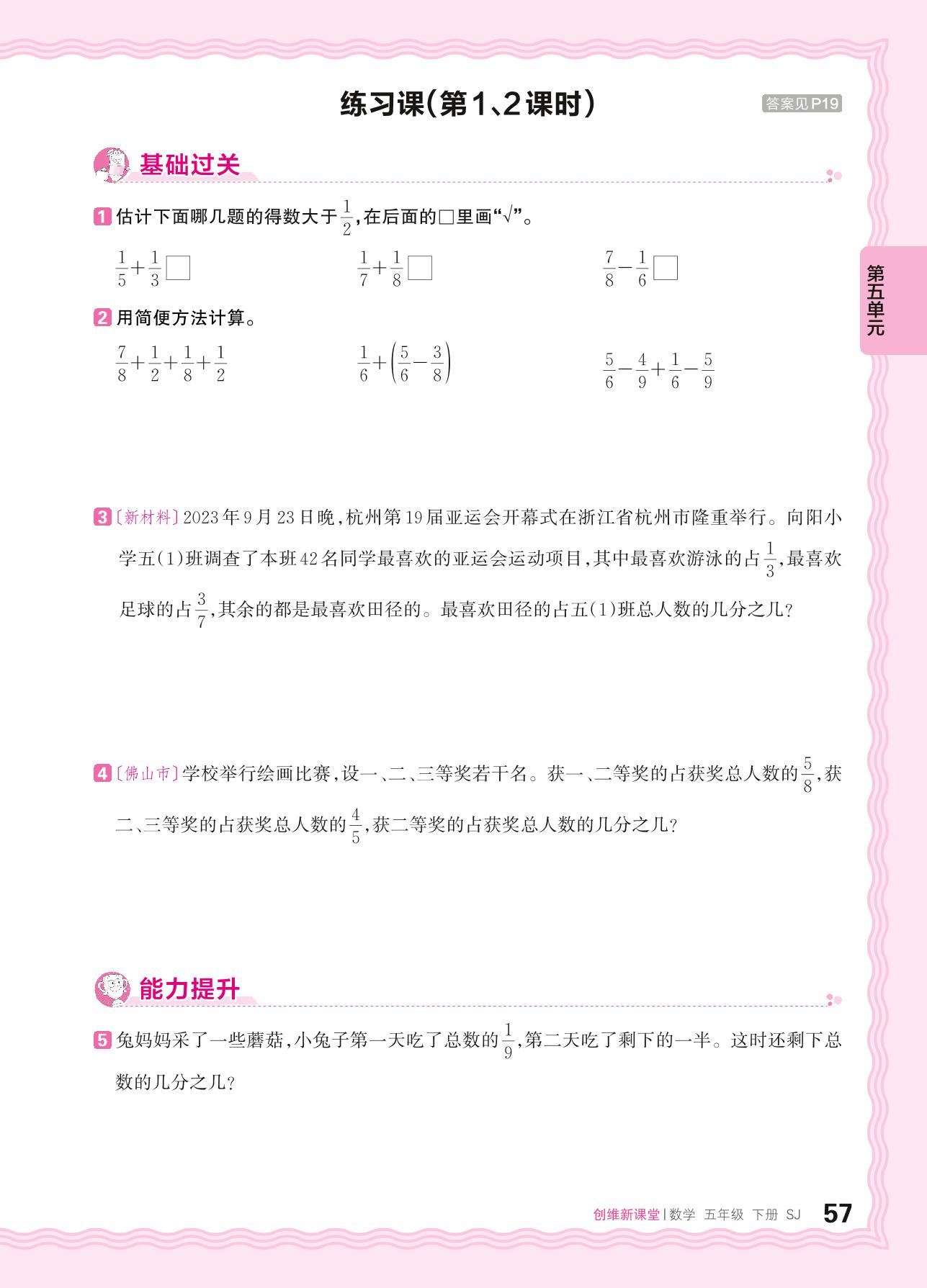 2024春下册五年级数学苏教版 第五单元 分数加法和减法——异分母分数加、减法 分数加减混合运算练习课