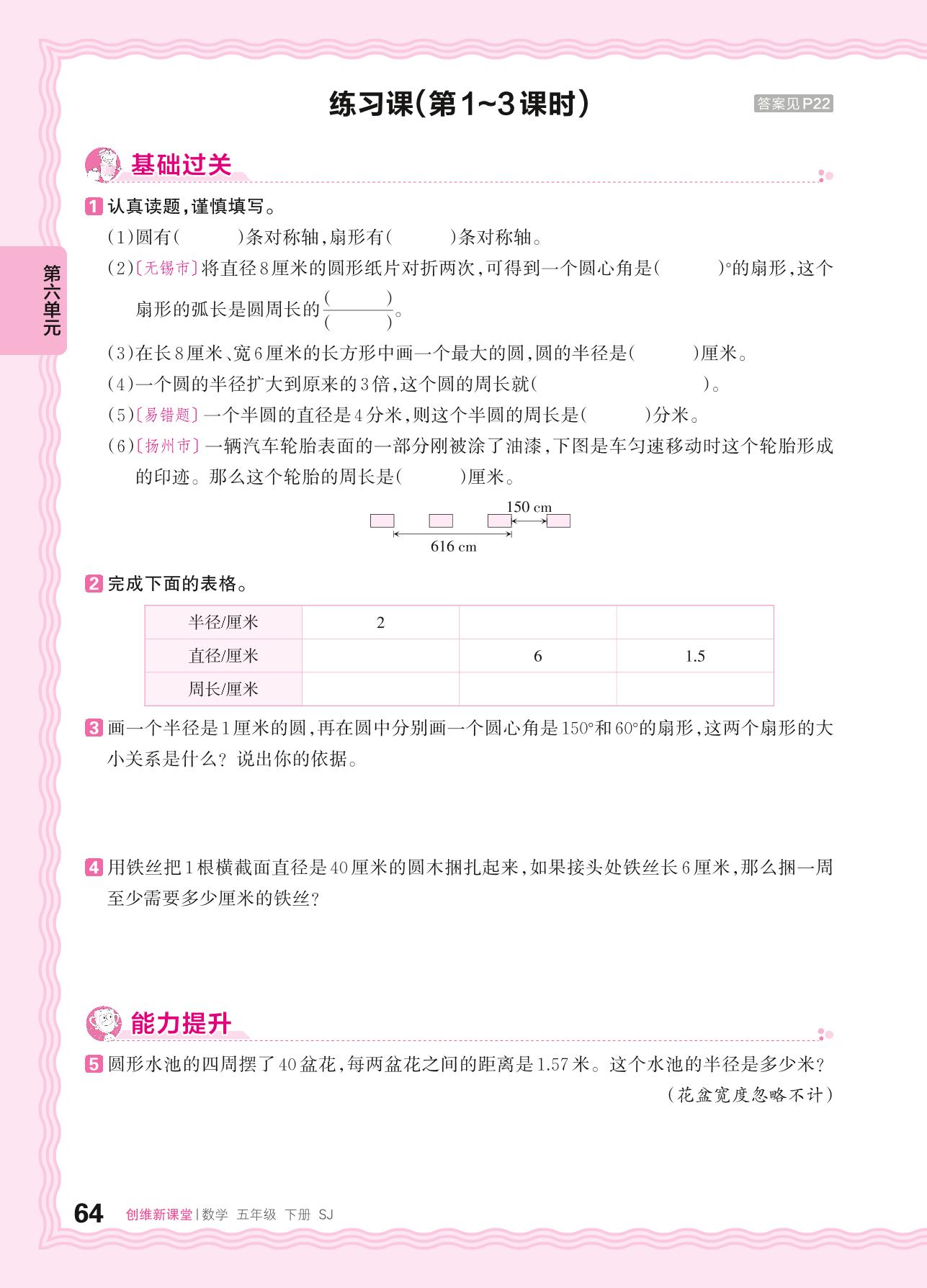 2024春下册五年级数学苏教版 第六单元 圆——圆的认识、扇形的初步认识、圆的周长练习课