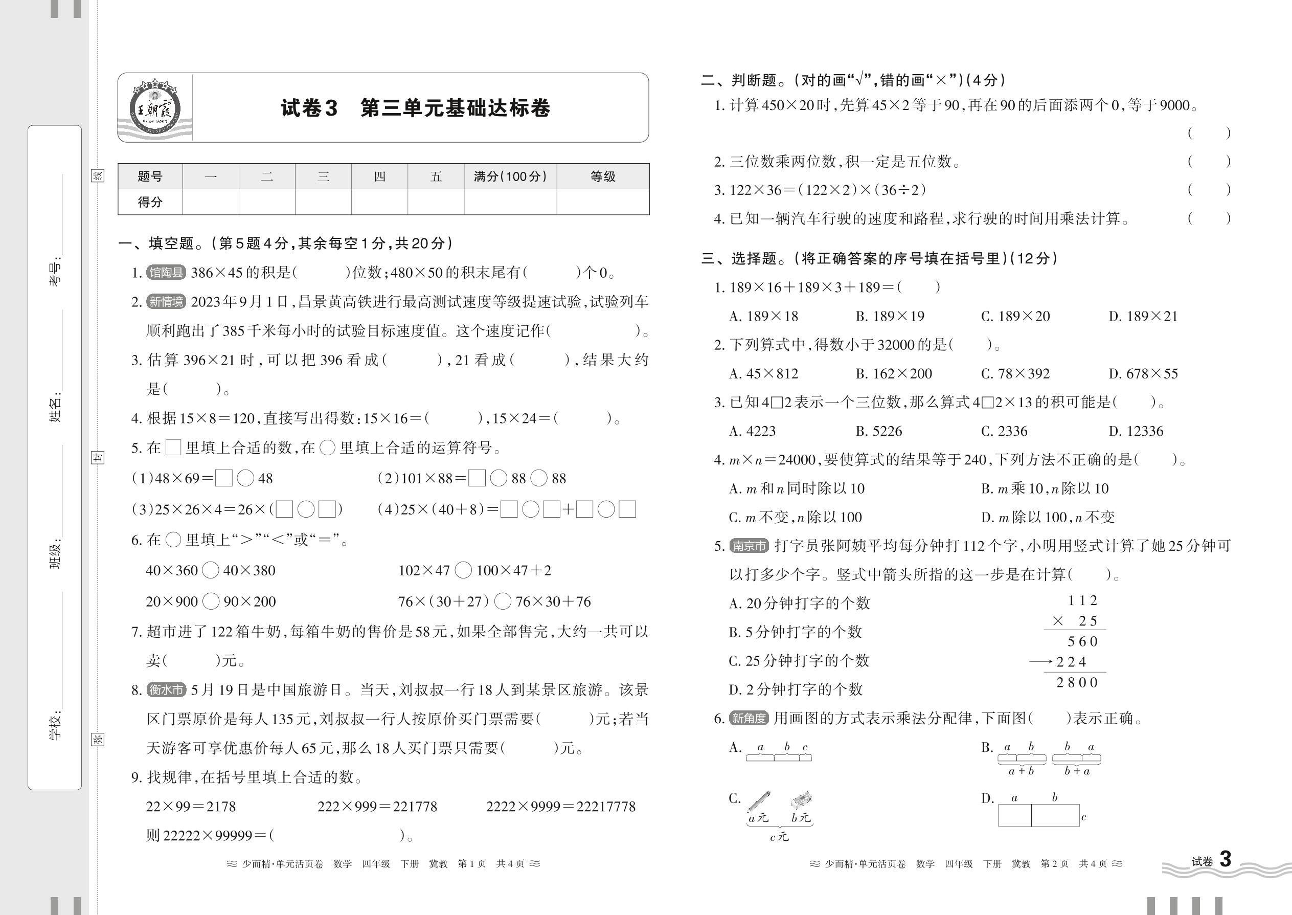 2024春下册四年级数学冀教版 第三单元基础达标卷【3】
