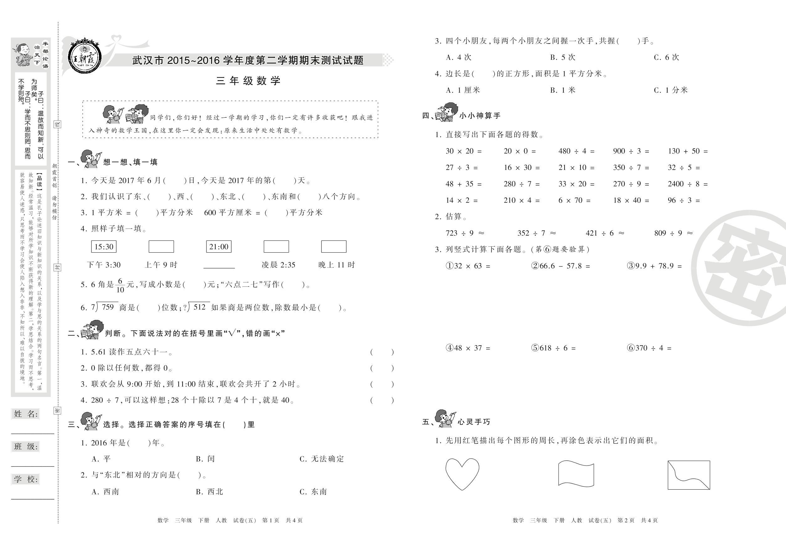 2015-2016学年第二学期武汉市三年级数学试卷(人教版)【5】