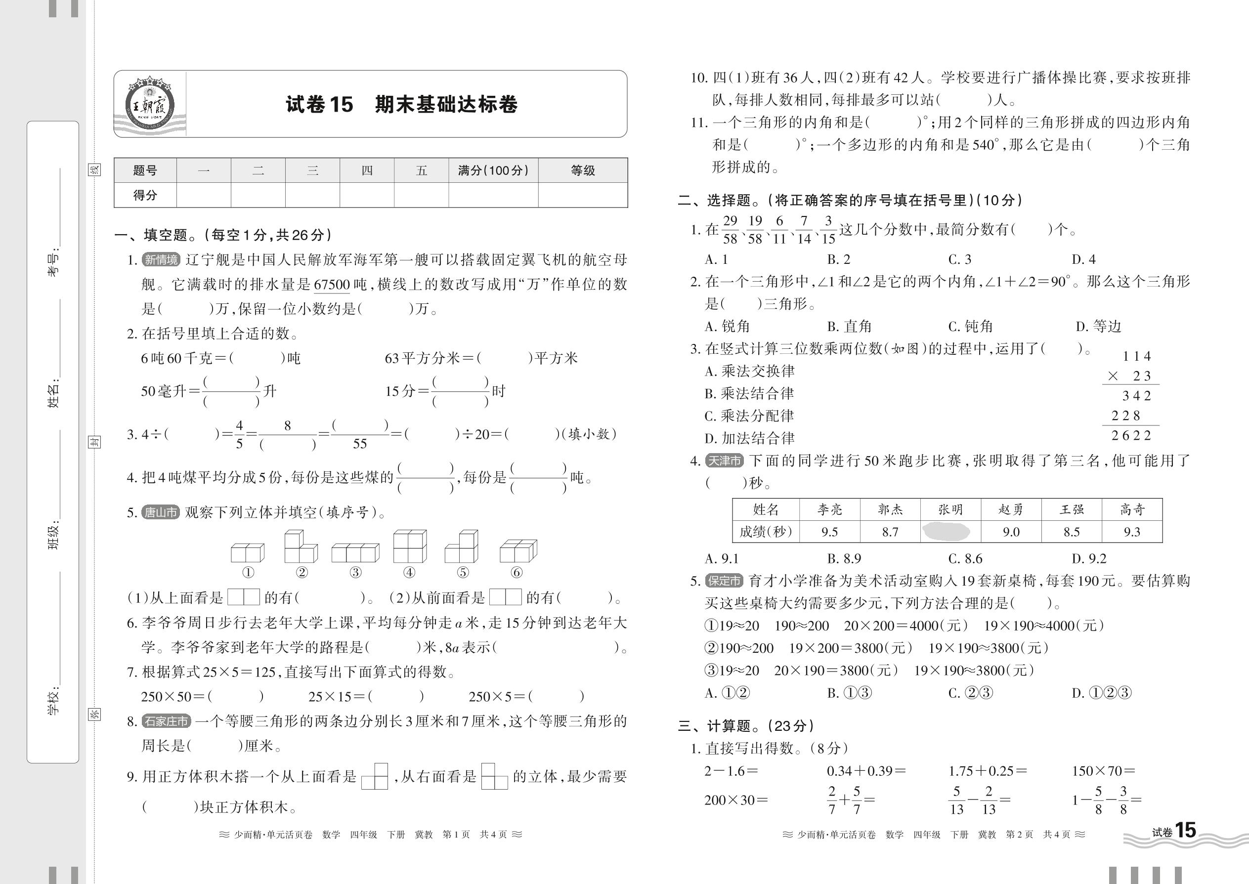 2024春下册四年级数学冀教版 期末基础达标卷【15】