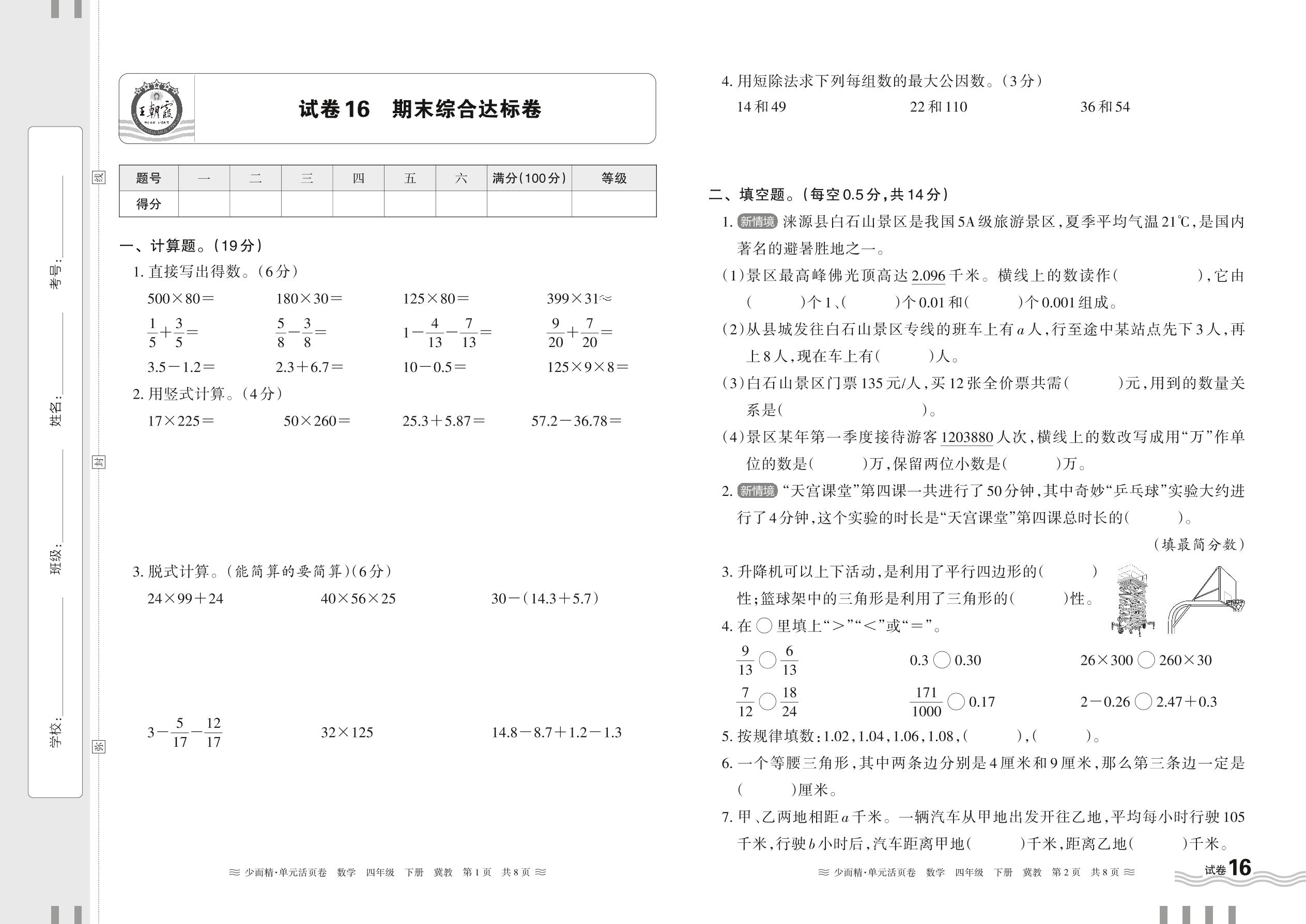 2024春下册四年级数学冀教版 期末综合达标卷【16】