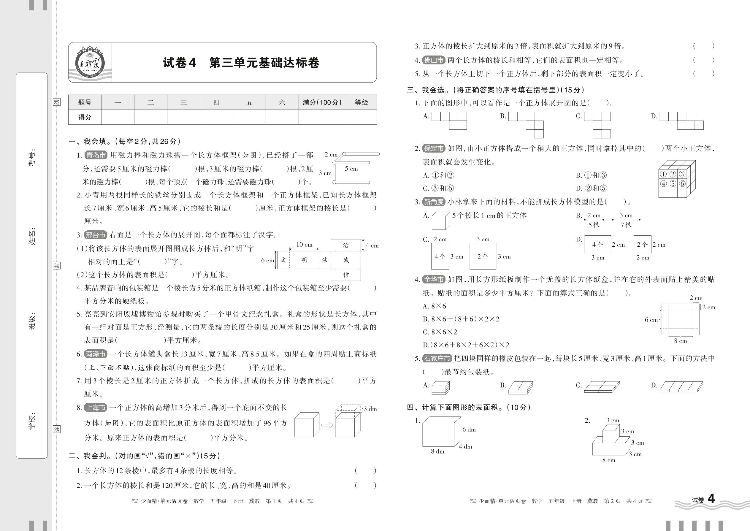 五年级数学冀教版下册单元卷