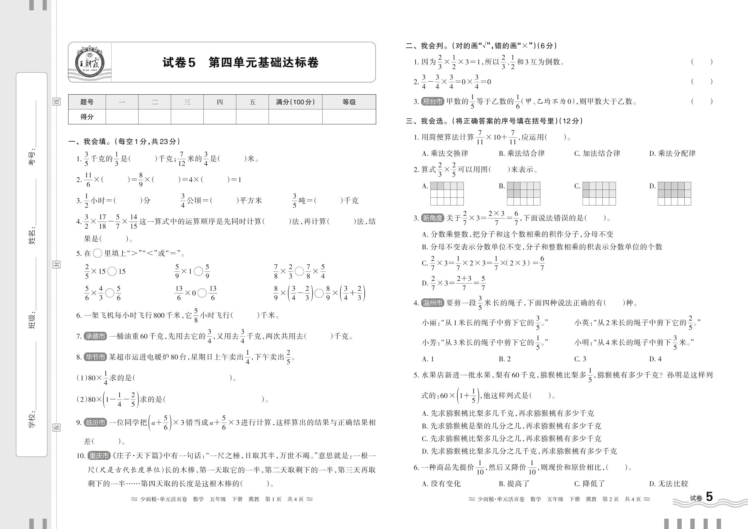 2024春下册五年级数学冀教版 第四单元基础达标卷【5】