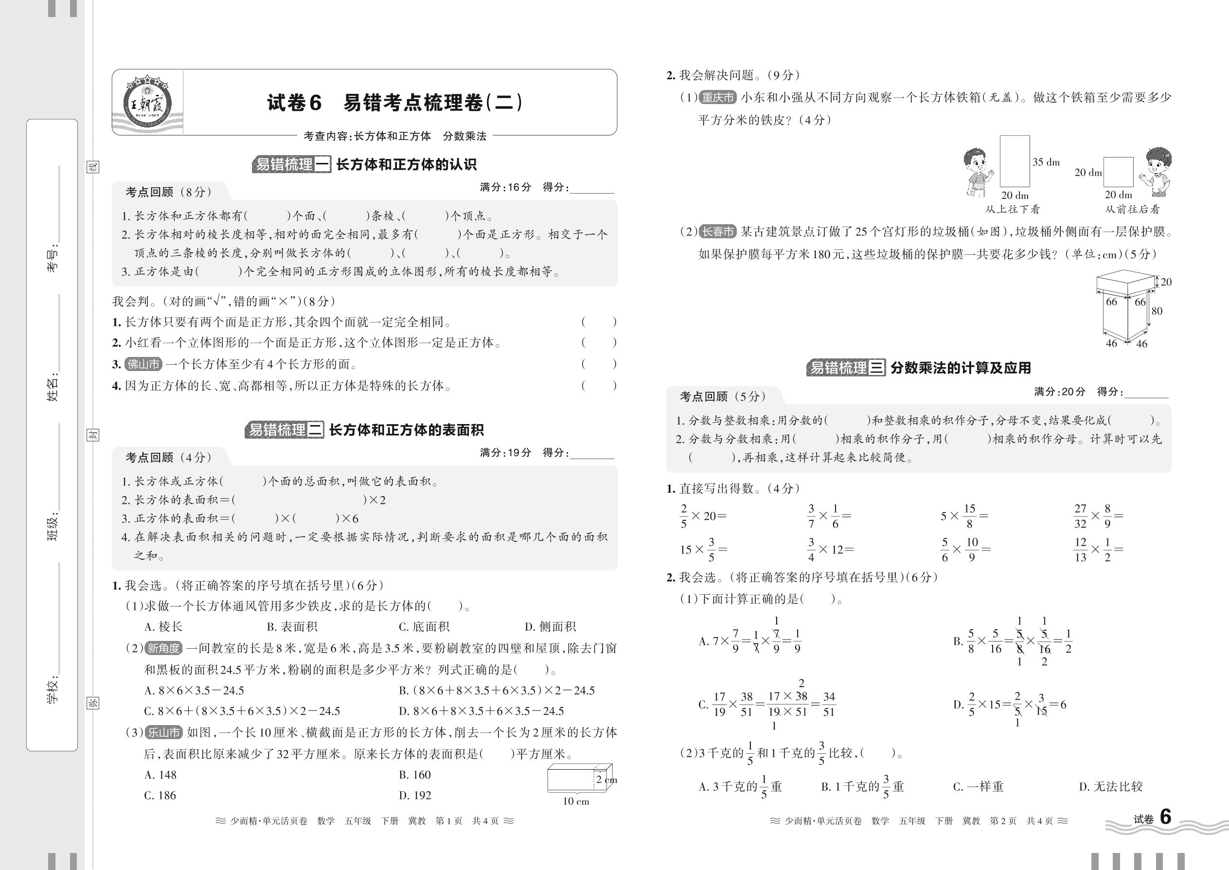 2024春下册五年级数学冀教版 易错考点梳理卷——长方体和正方体 分数乘法【6】