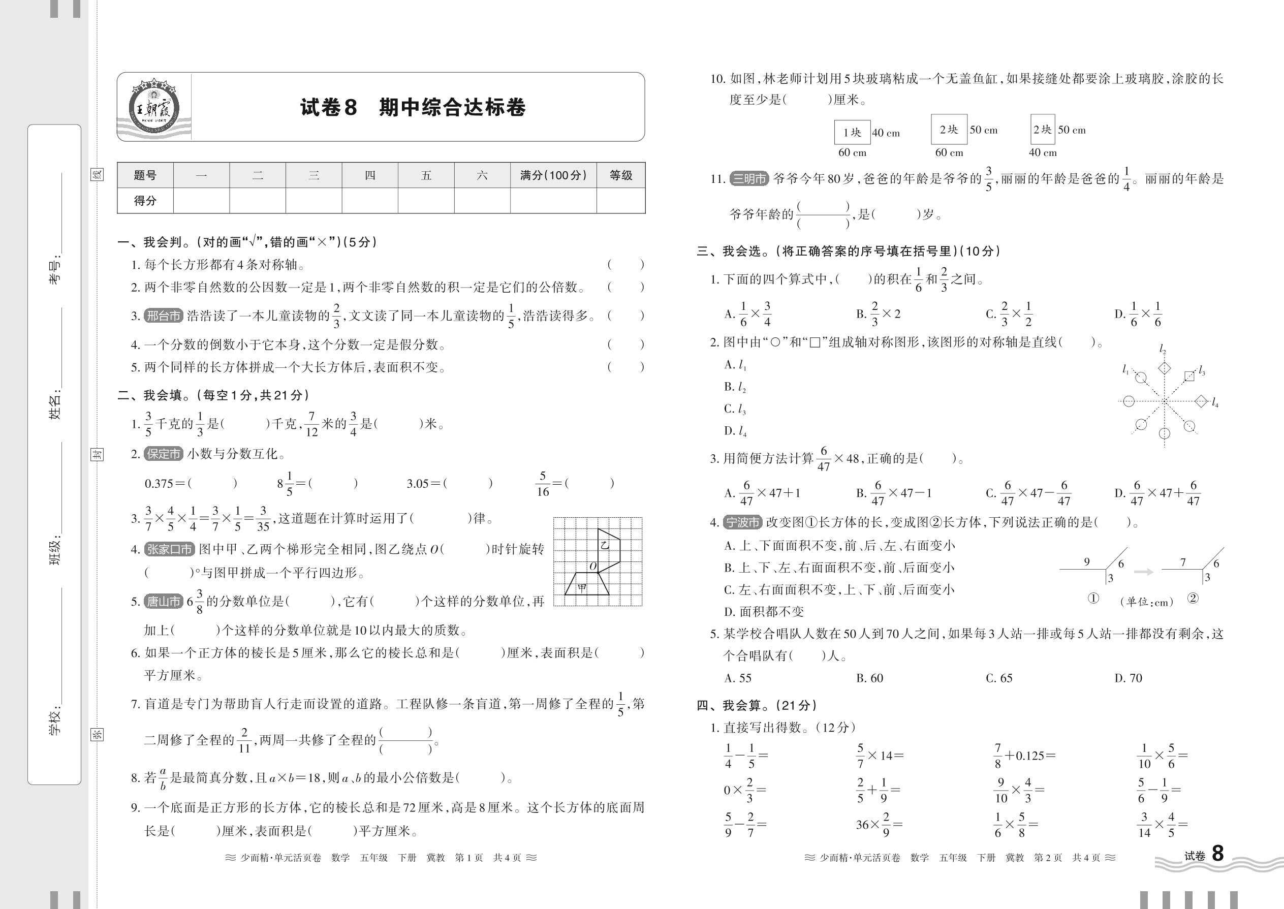 五年级数学冀教版下册期中卷