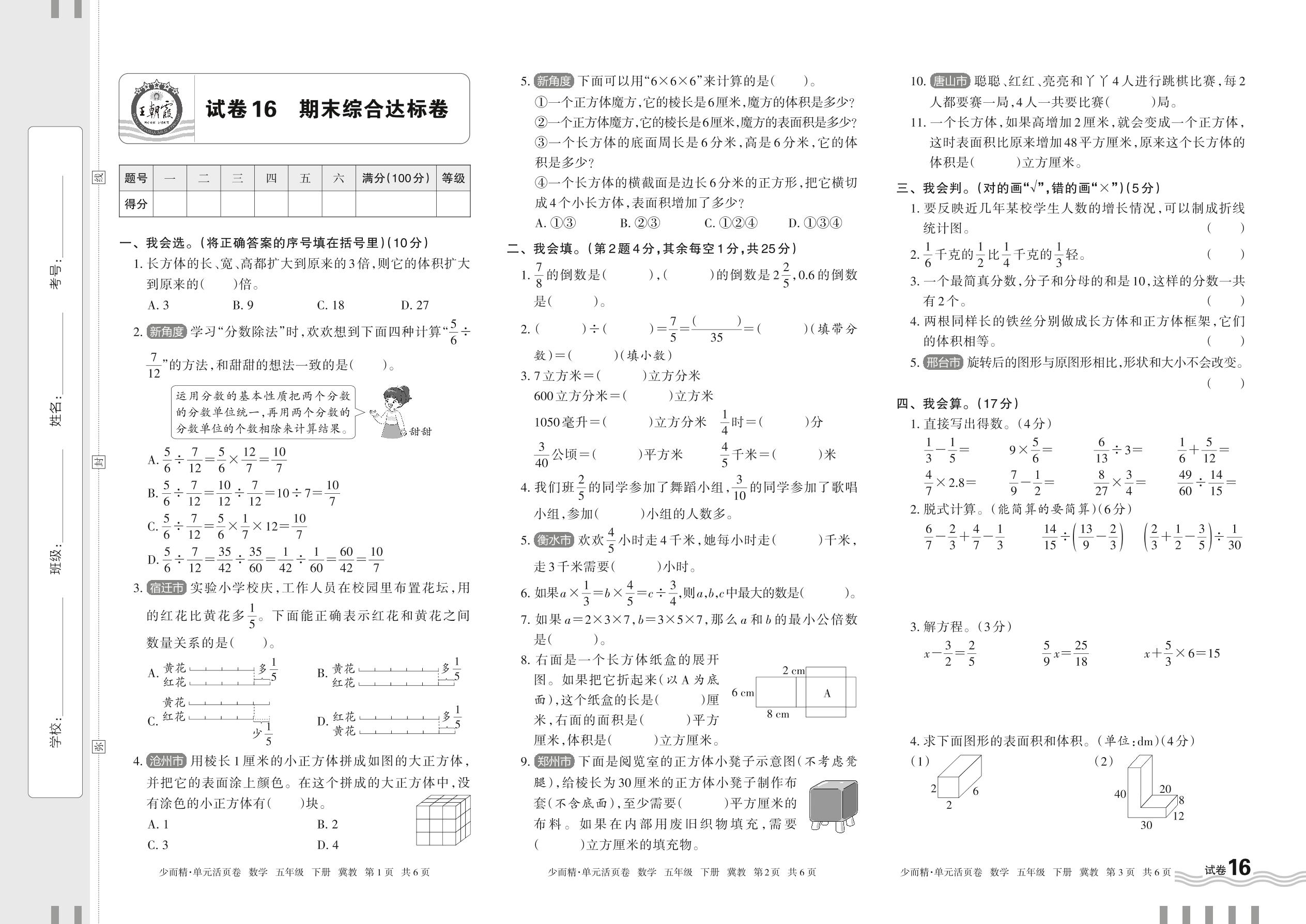 2024春下册五年级数学冀教版 期末综合达标卷【16】