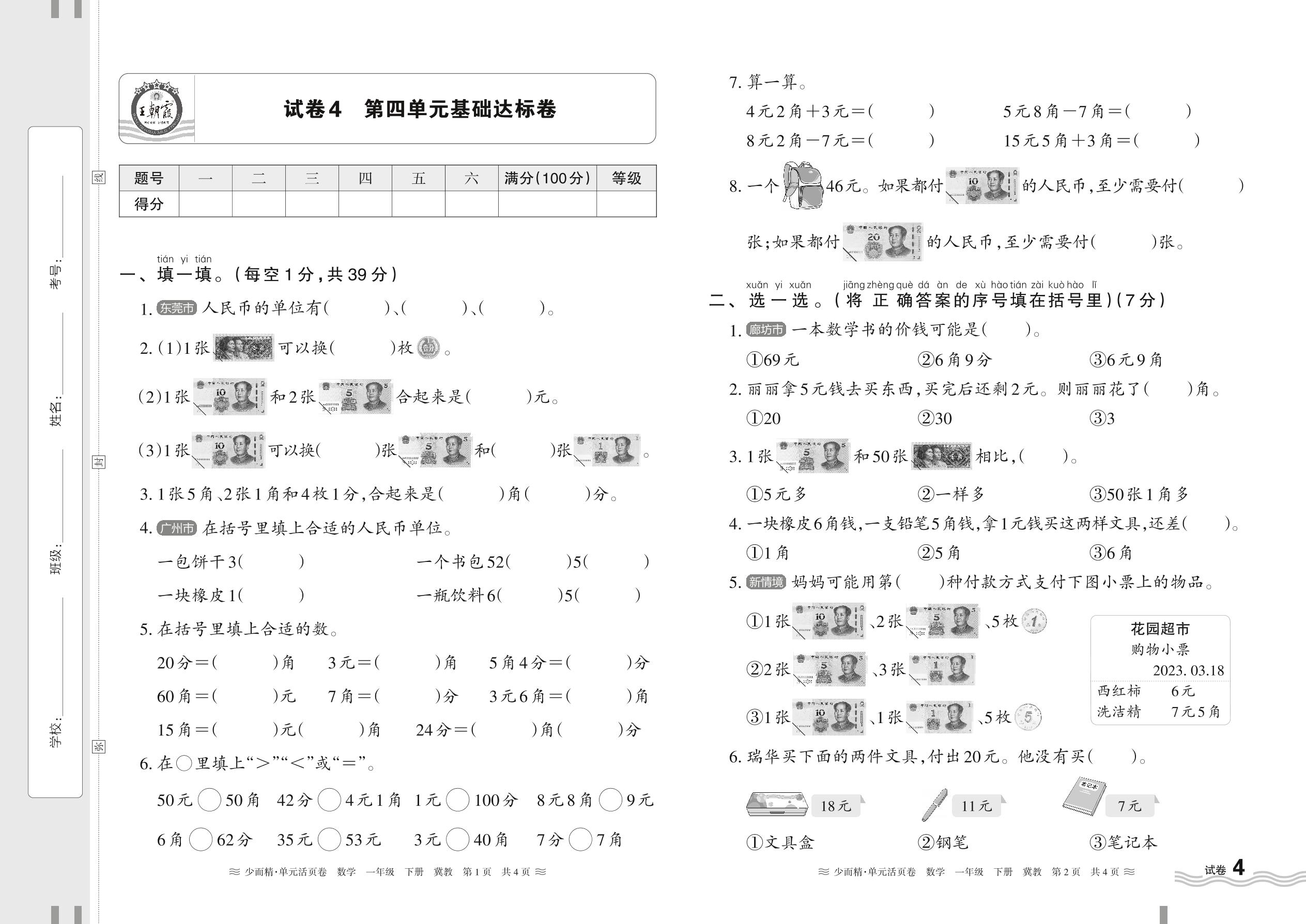 2024春下册一年级数学冀教版 第四单元基础达标卷【4】
