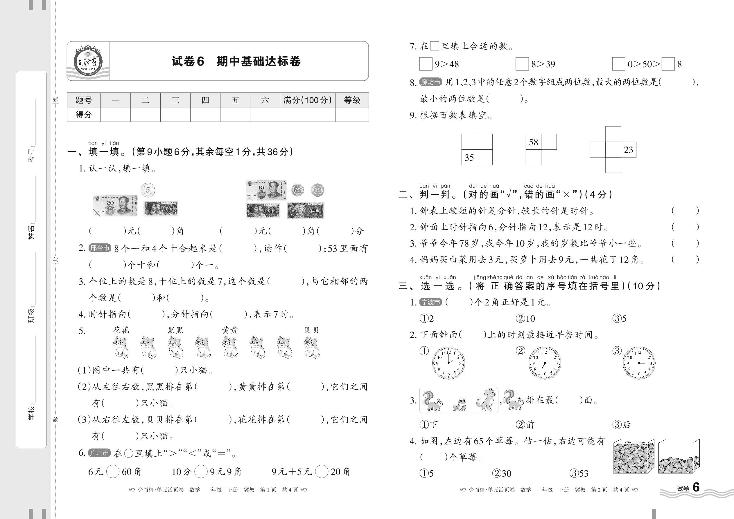 2024春下册一年级数学冀教版 期中基础达标卷【6】