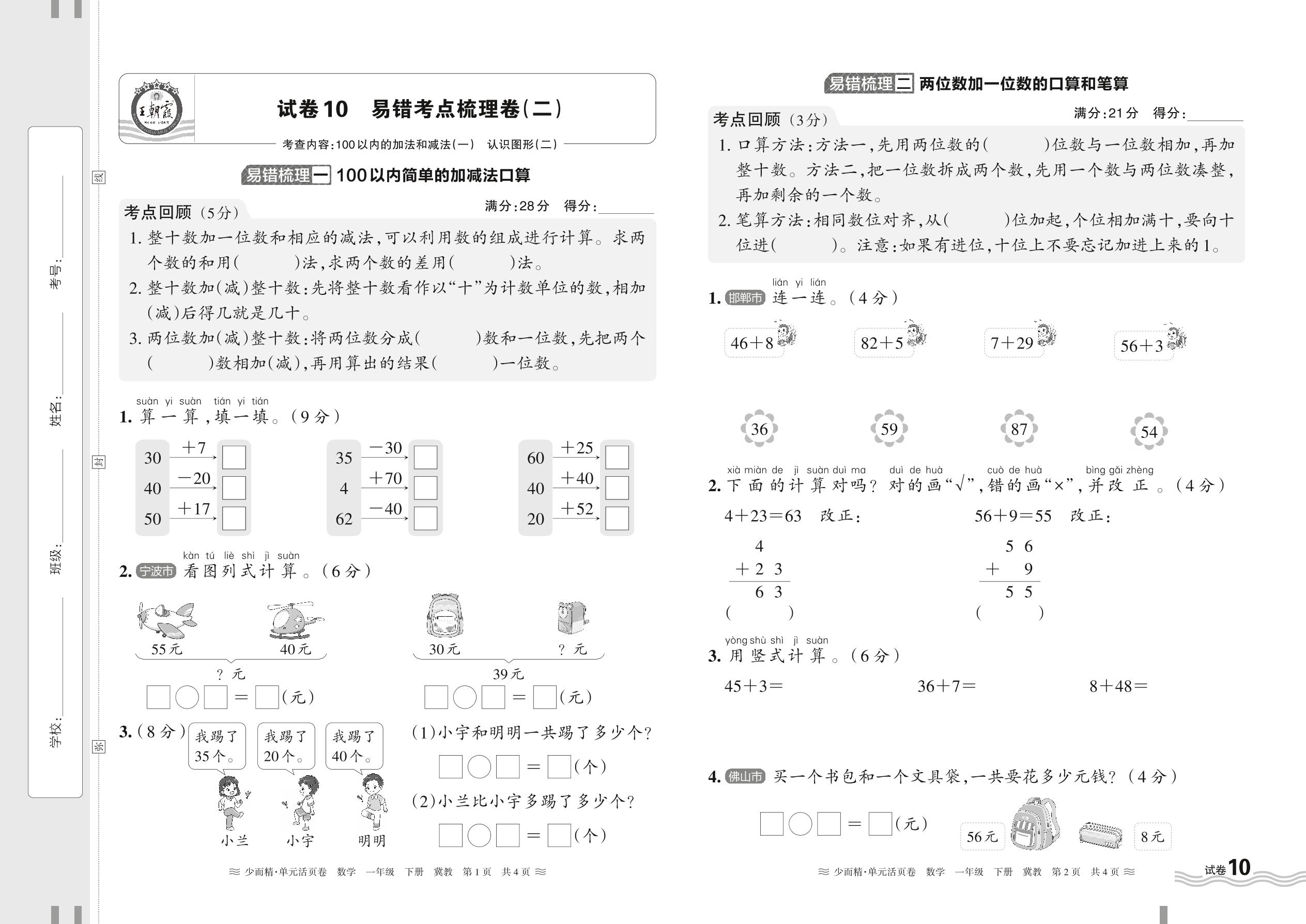 2024春下册一年级数学冀教版 易错考点梳理卷——100以内的加法和减法(一) 认识图形(二)【10】