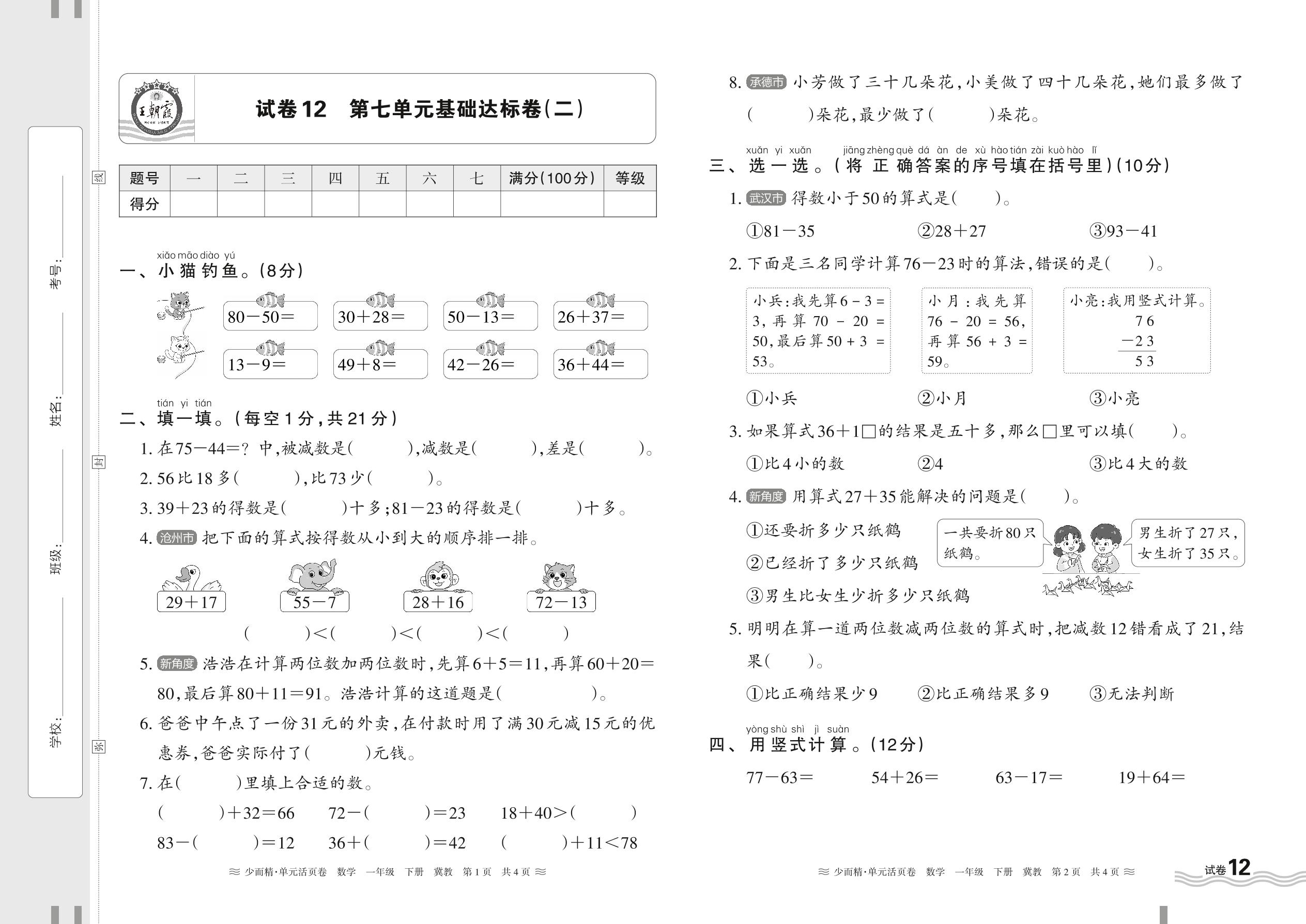2024春下册一年级数学冀教版 第七单元基础达标卷(二)【12】
