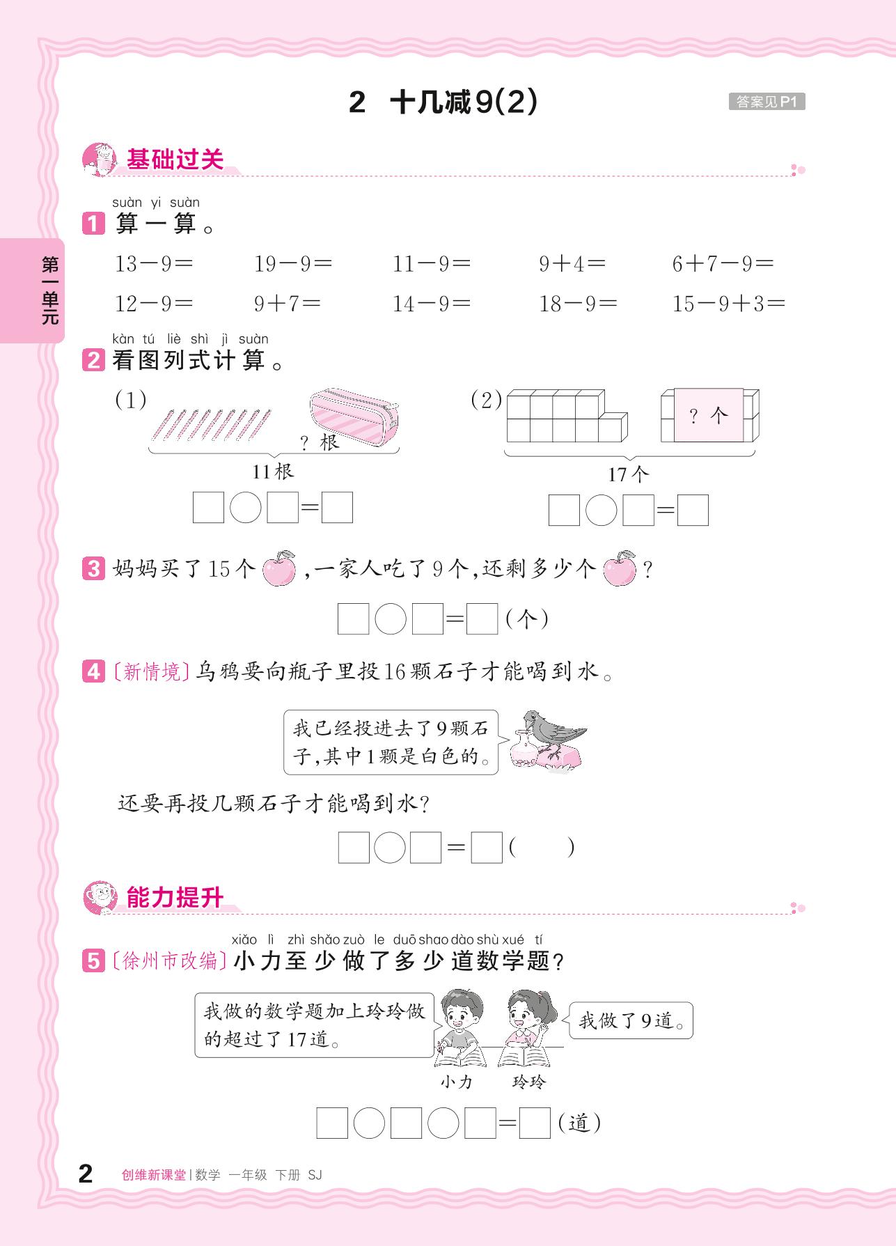 2024春下册一年级数学苏教版 第一单元 20以内的退位减法——2. 十几减9(2)