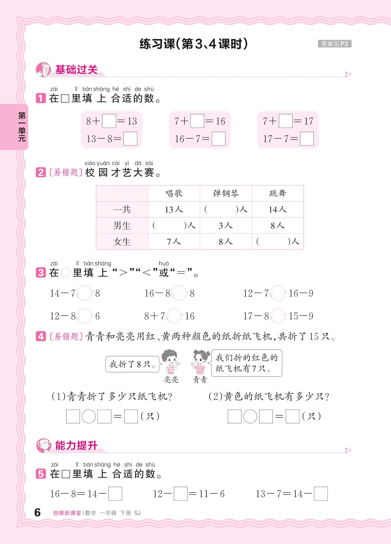 2024春下册一年级数学苏教版 第一单元 20以内的退位减法——十几减8、7练习课