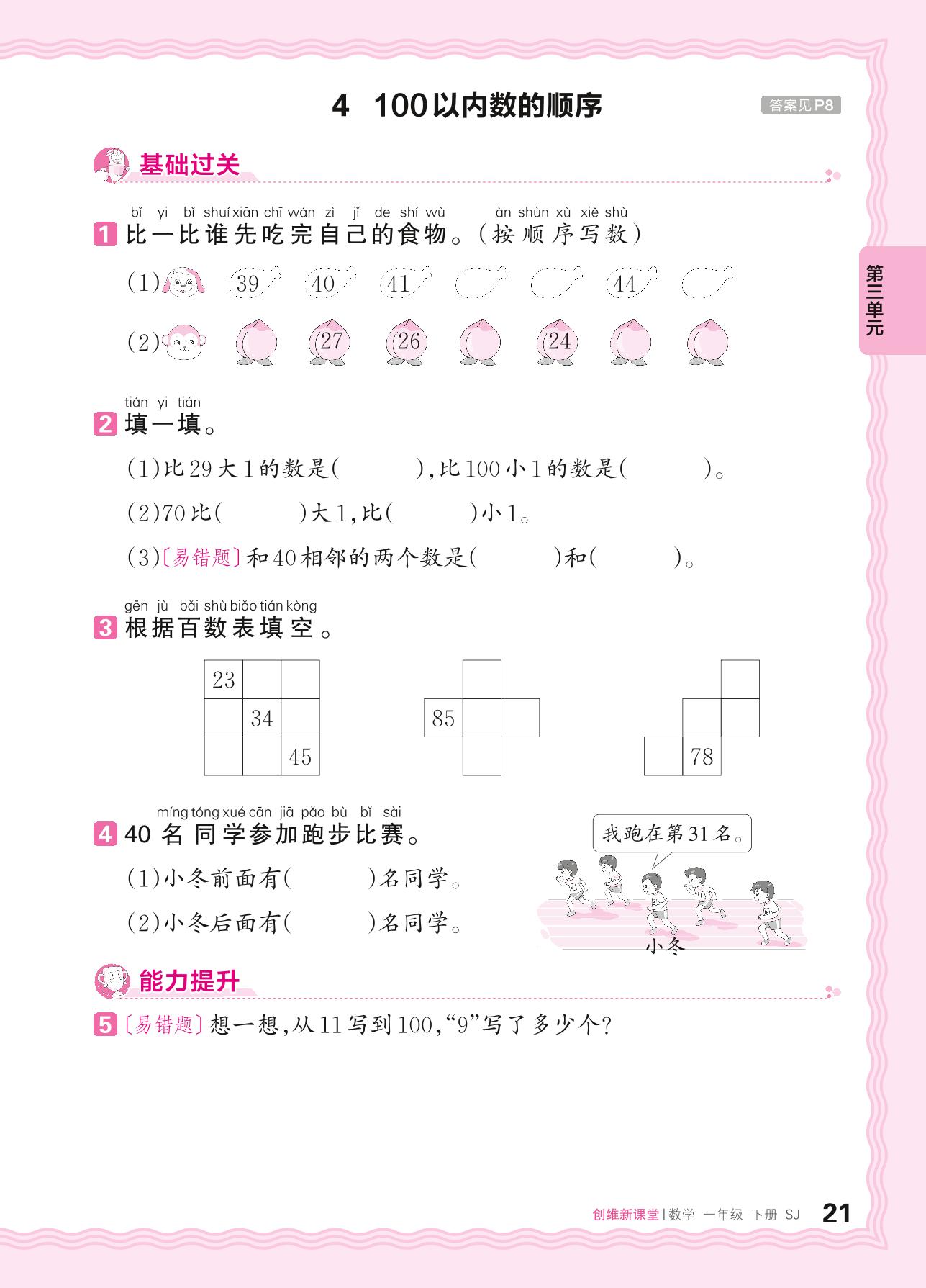 2024春下册一年级数学苏教版 第三单元 认识100以内的数——4. 100以内数的顺序