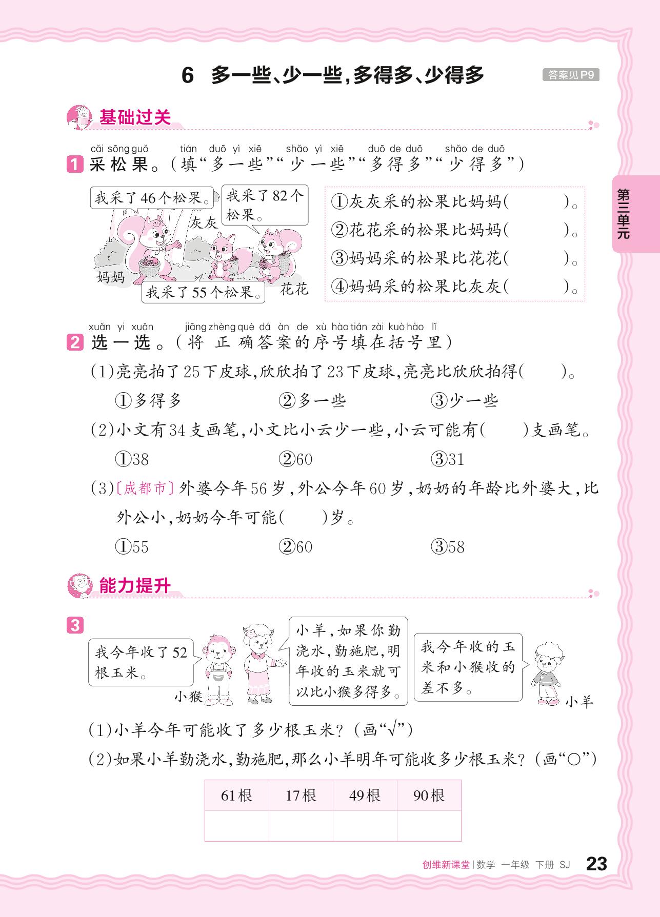 2024春下册一年级数学苏教版 第三单元 认识100以内的数——6. 多一些、少一些,多得多、少得多