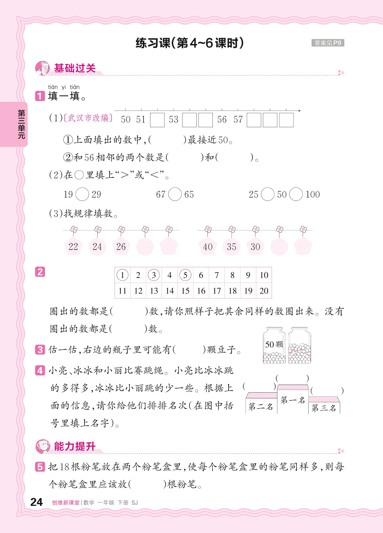 2024春下册一年级数学苏教版 第三单元 认识100以内的数——100以内数的顺序 100以内数的大小比较 多一些、少一些,多得多、少得多练习课