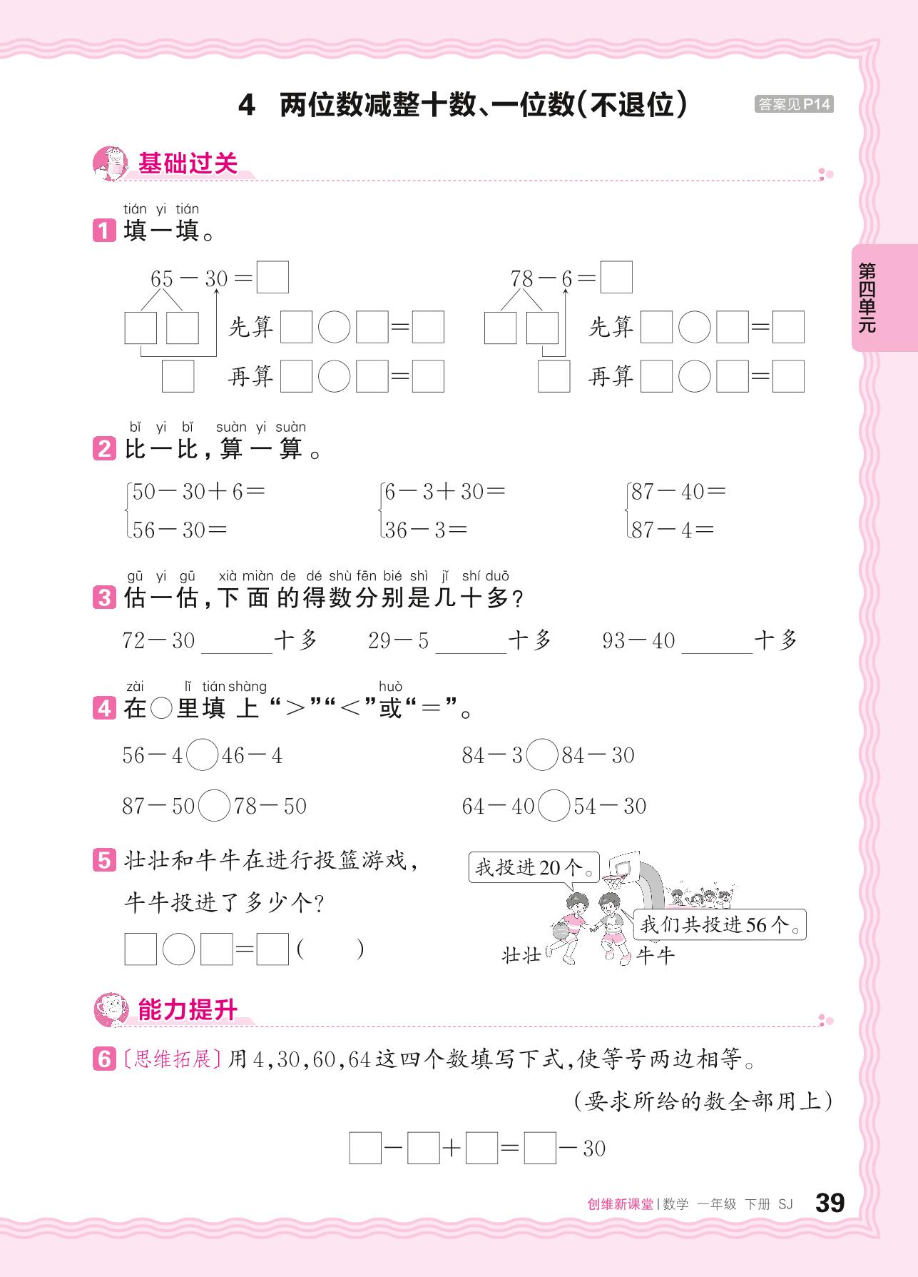 2024春下册一年级数学苏教版 第四单元 100以内的加法和减法(一)——4. 两位数减整十数、一位数(不退位)