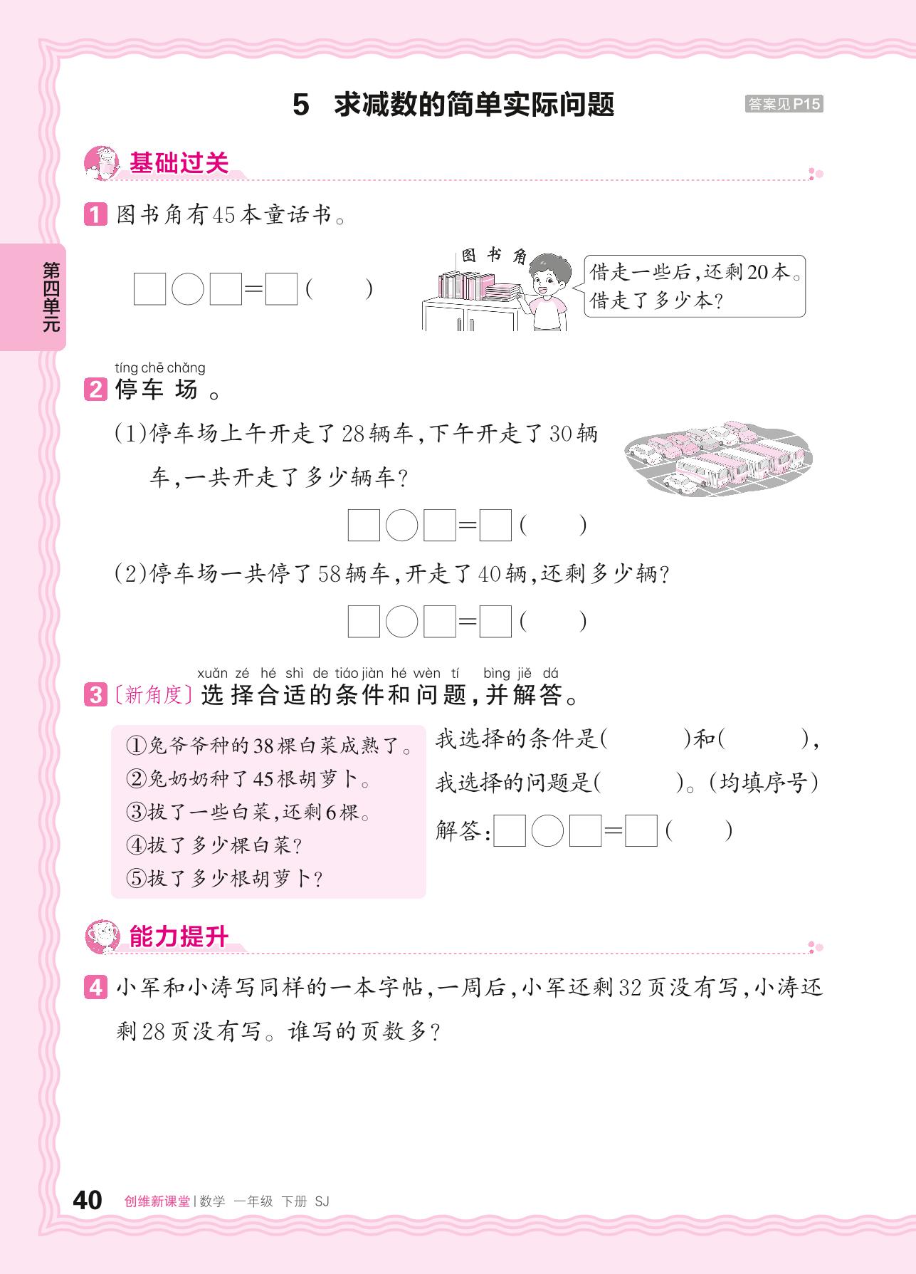 2024春下册一年级数学苏教版 第四单元 100以内的加法和减法(一)——5. 求减数的简单实际问题