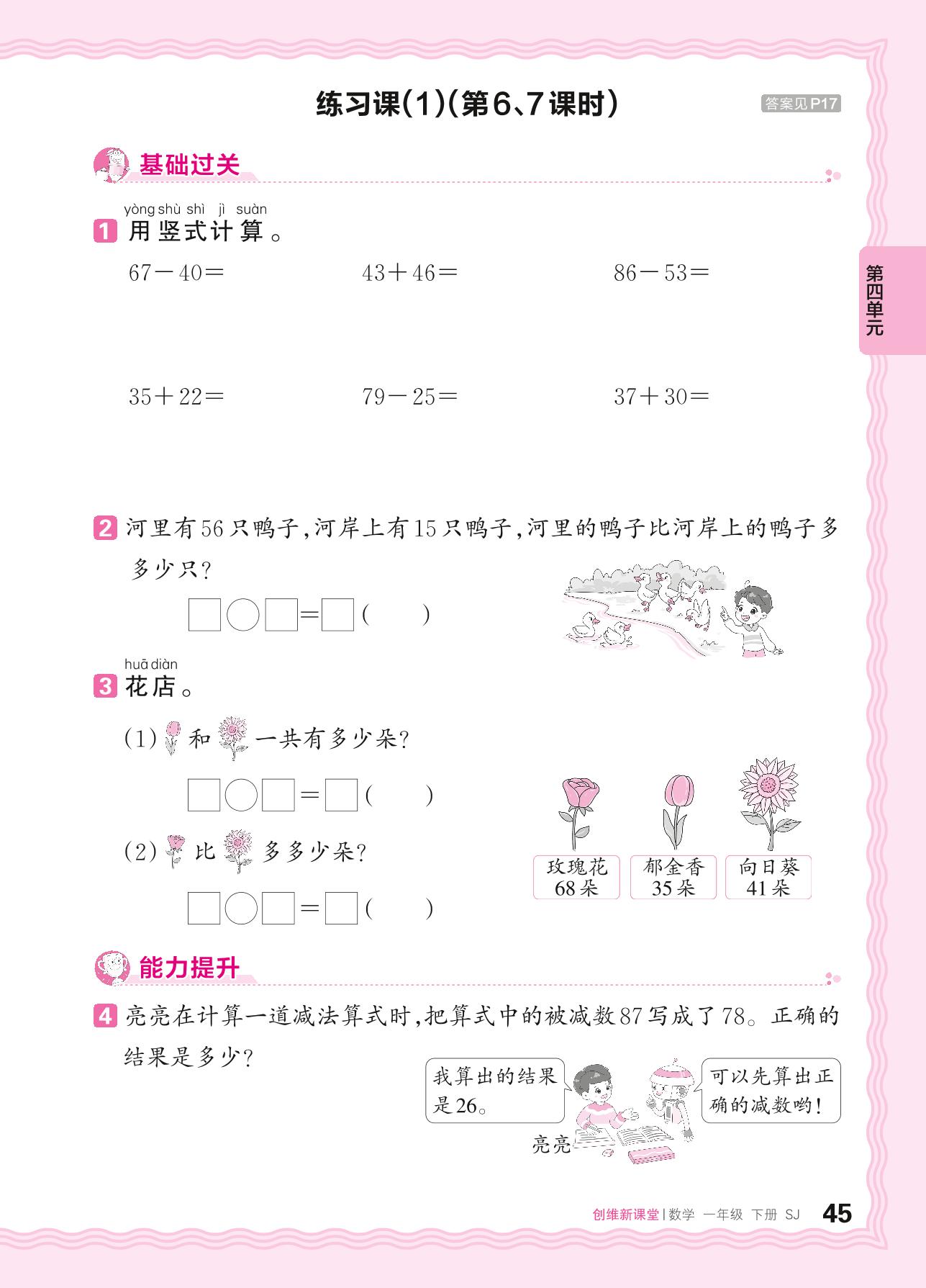 2024春下册一年级数学苏教版 第四单元 100以内的加法和减法(一)——两位数加、减两位数(不进位、不退位) 求两数相差多少的简单实际问题练习课(1)