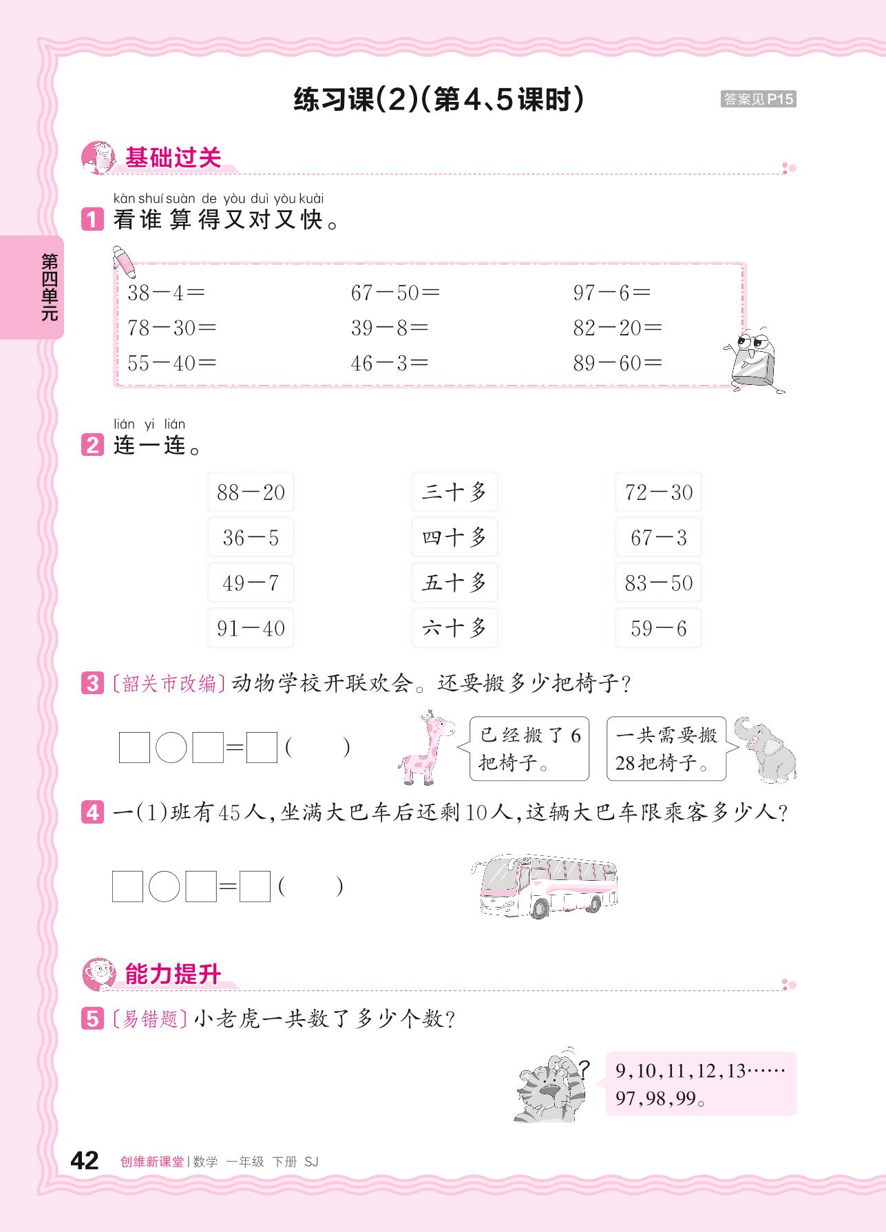 2024春下册一年级数学苏教版 第四单元 100以内的加法和减法(一)——两位数减整十数、一位数(不退位) 求减数的简单实际问题练习课(2)