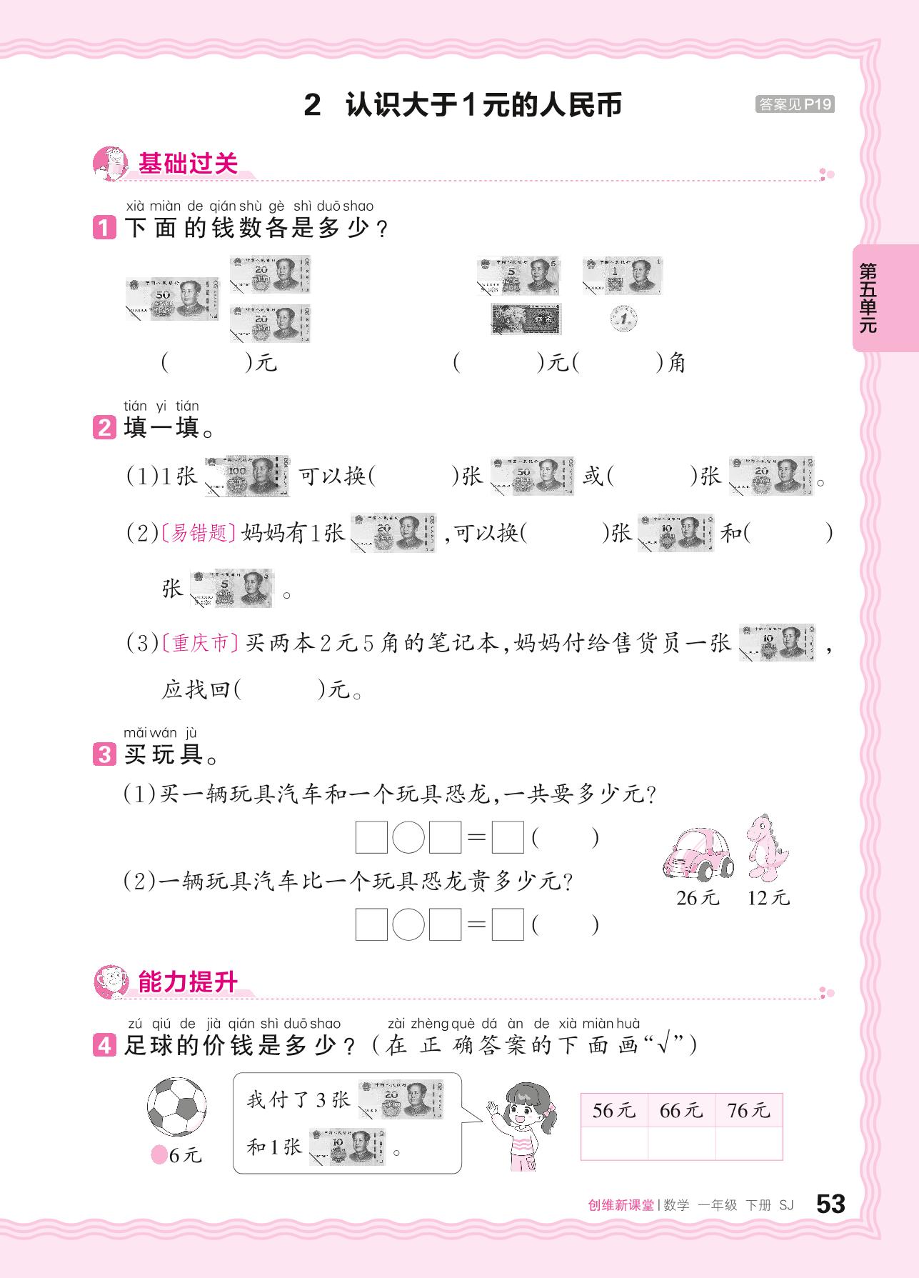 2024春下册一年级数学苏教版 第五单元 元、角、分——2. 认识大于1元的人民币_R240123162726154