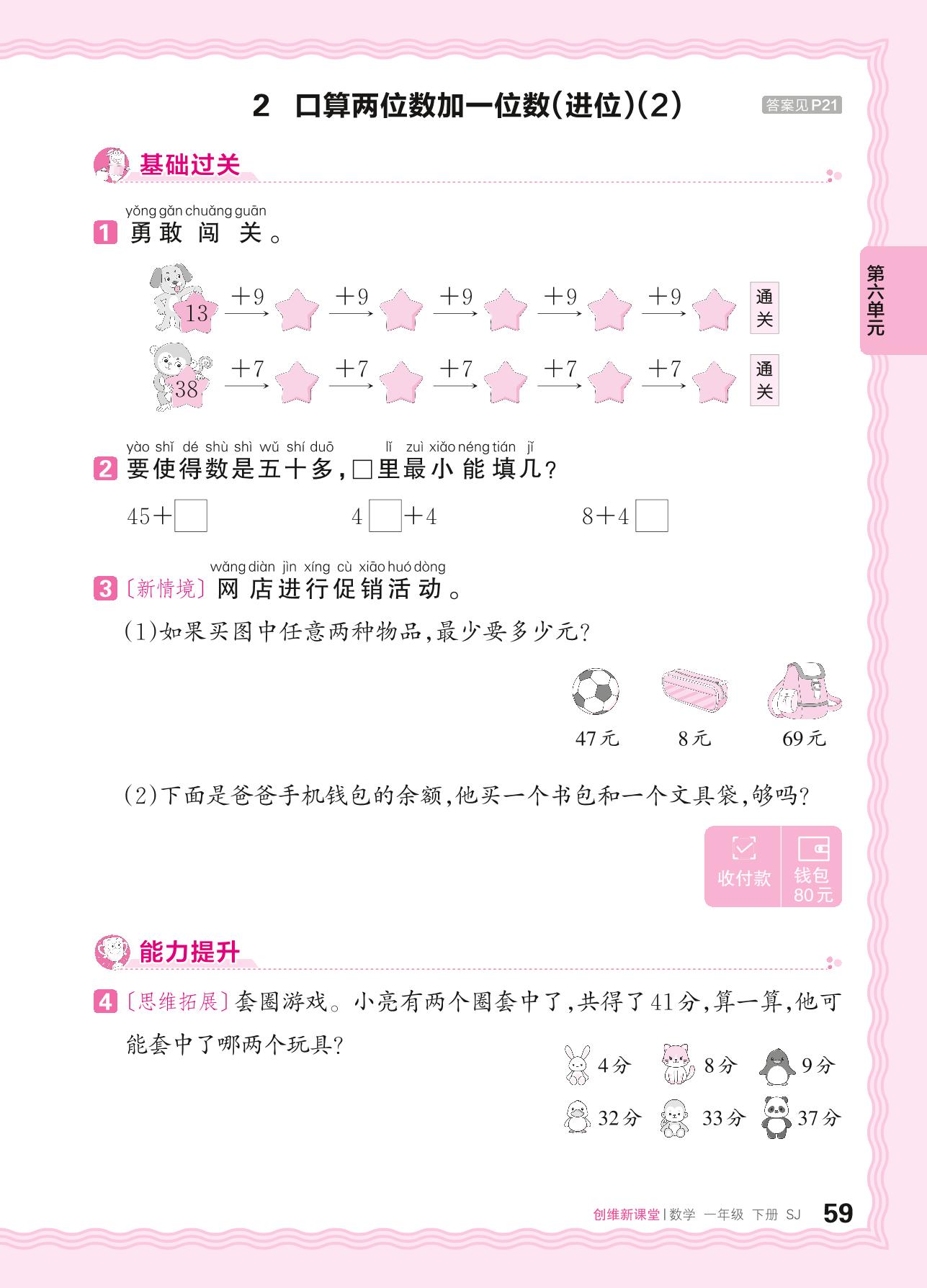 2024春下册一年级数学苏教版 第六单元 100以内的加法和减法(二)——2. 口算两位数加一位数(进位)(2)