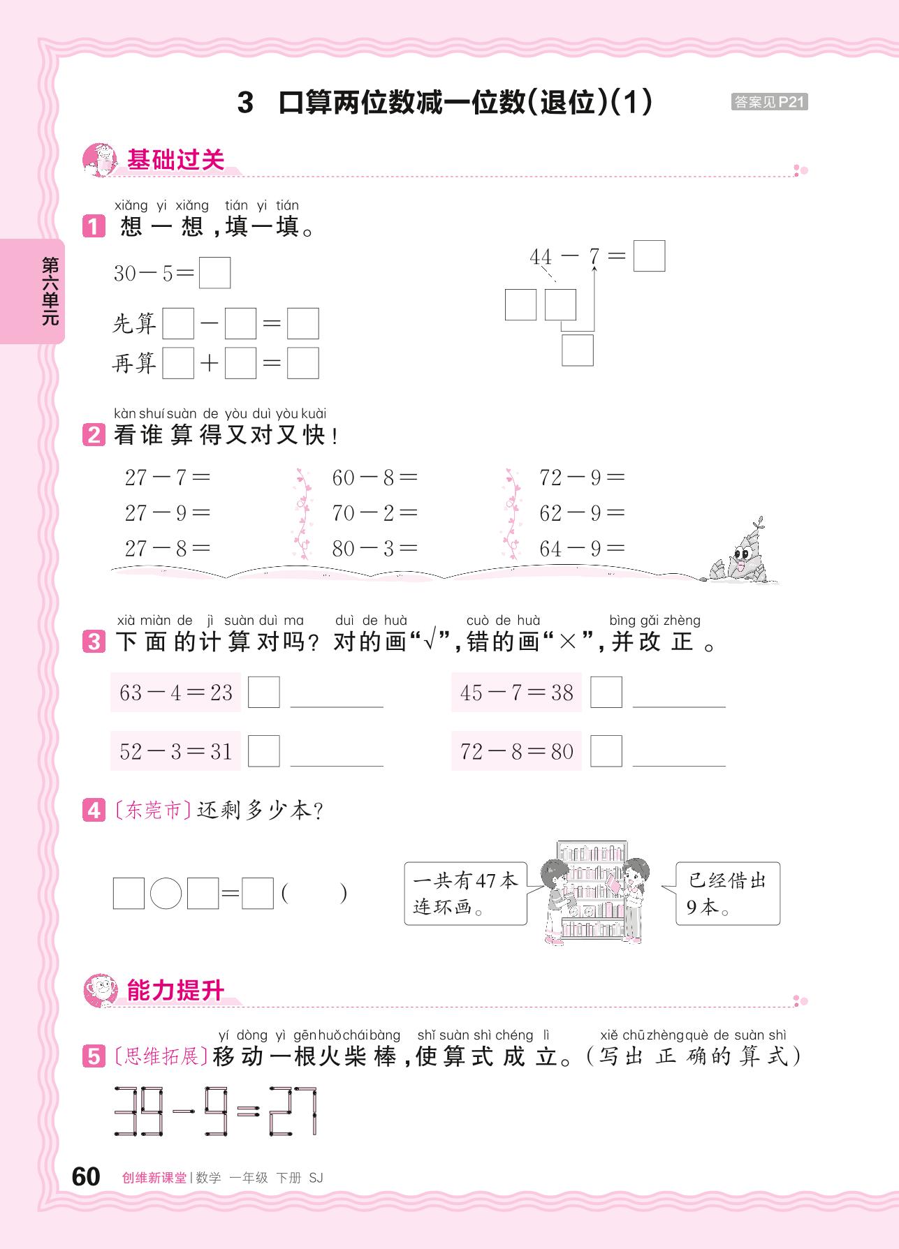 2024春下册一年级数学苏教版 第六单元 100以内的加法和减法(二)——3. 口算两位数减一位数(退位)(1)